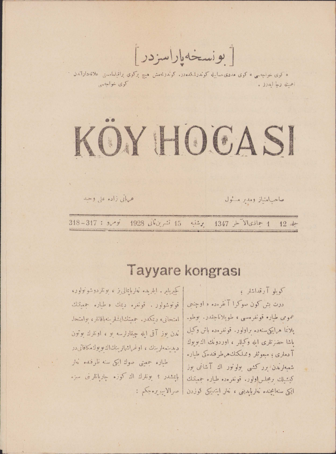 Köy Hocası, Tayyare Kongrası, 1928 tarihli