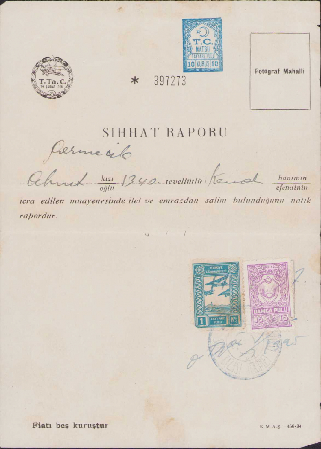 Sıhhat Raporu, Teyyare Cemiyeti antetli, tayyare pullu, matbu pullu, 15x20