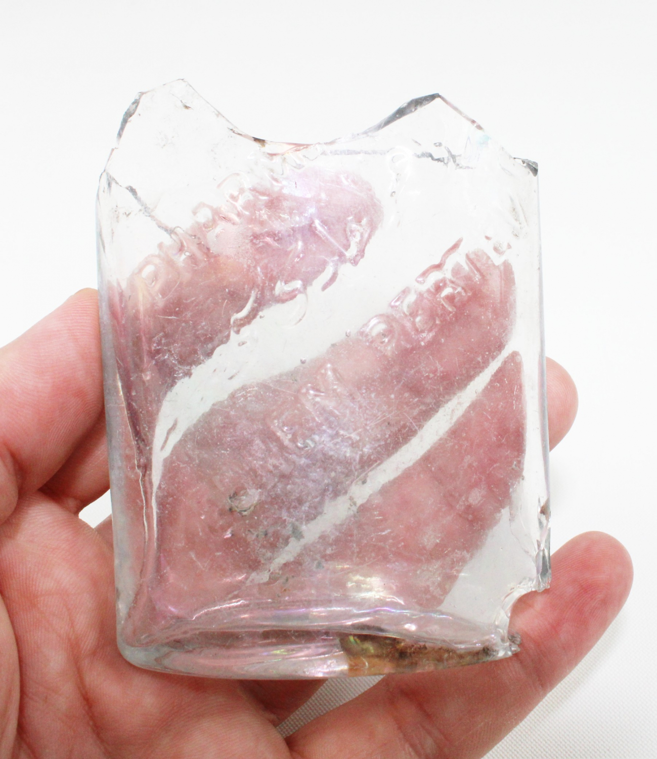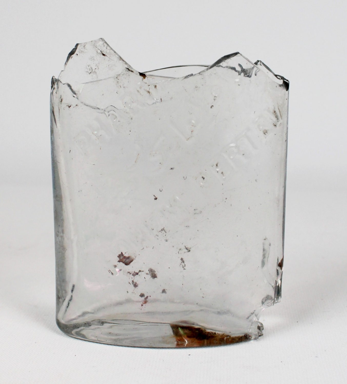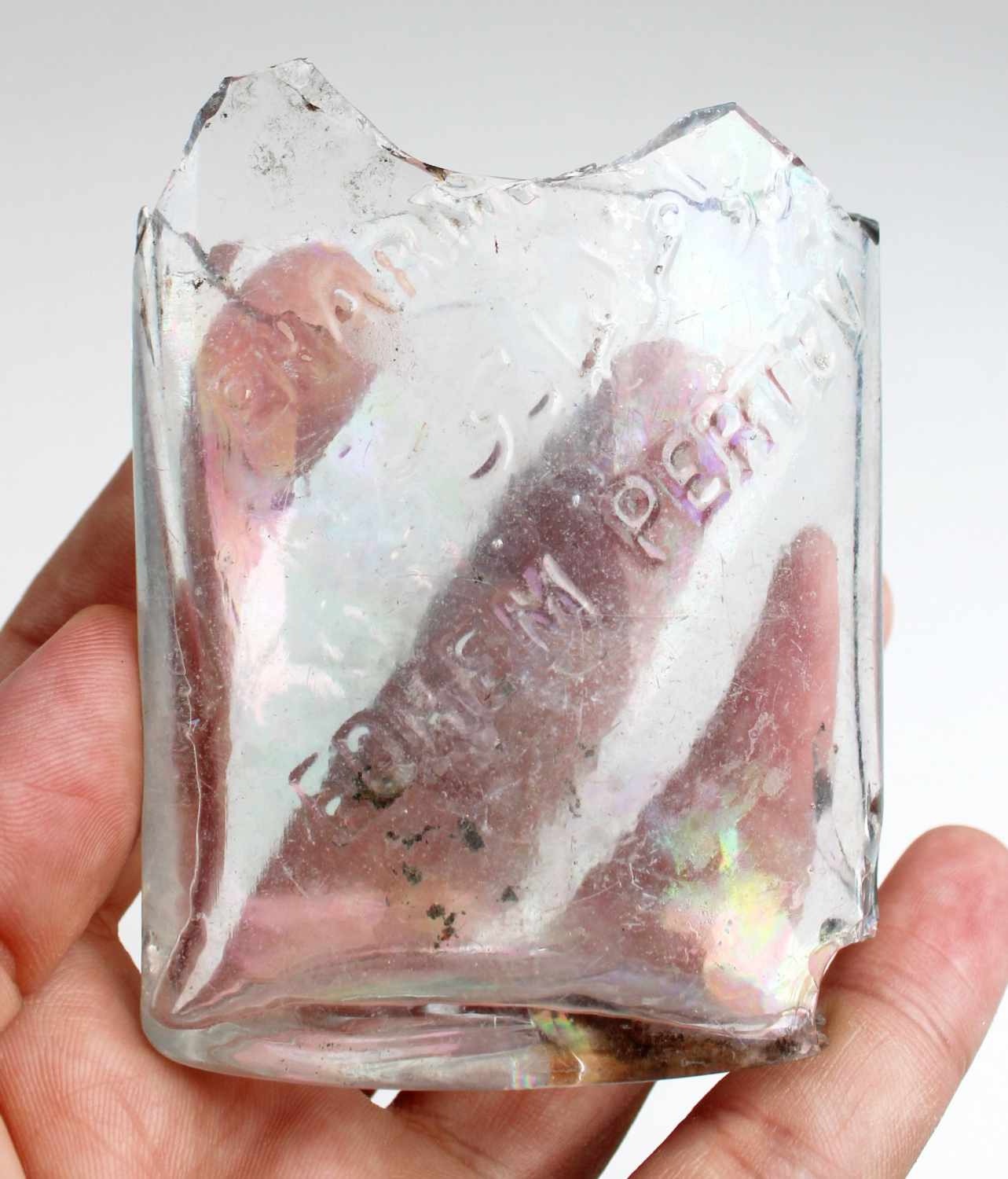 Ethem Pertev Osmanlıca ve Franszca kabartma yazılı ilaç şişesi, kırık, haliyle, 8 cm