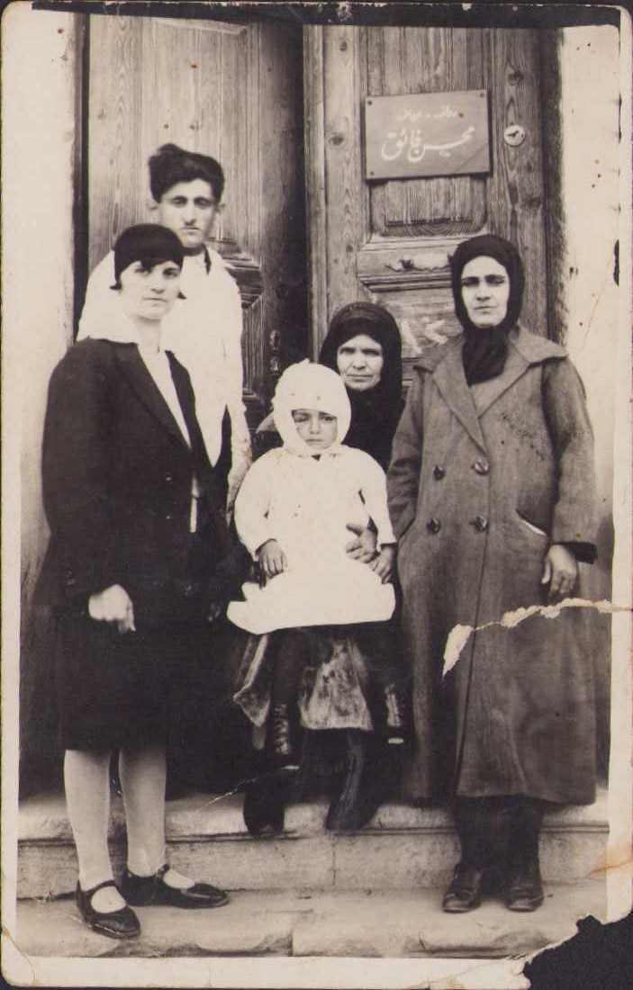 Doktor Muhsin Faik tabelası önünde fotoğraf, 1928 tarihli, Osmanlıca tabela ve arkası Osmanlıca yazılı, haliyle