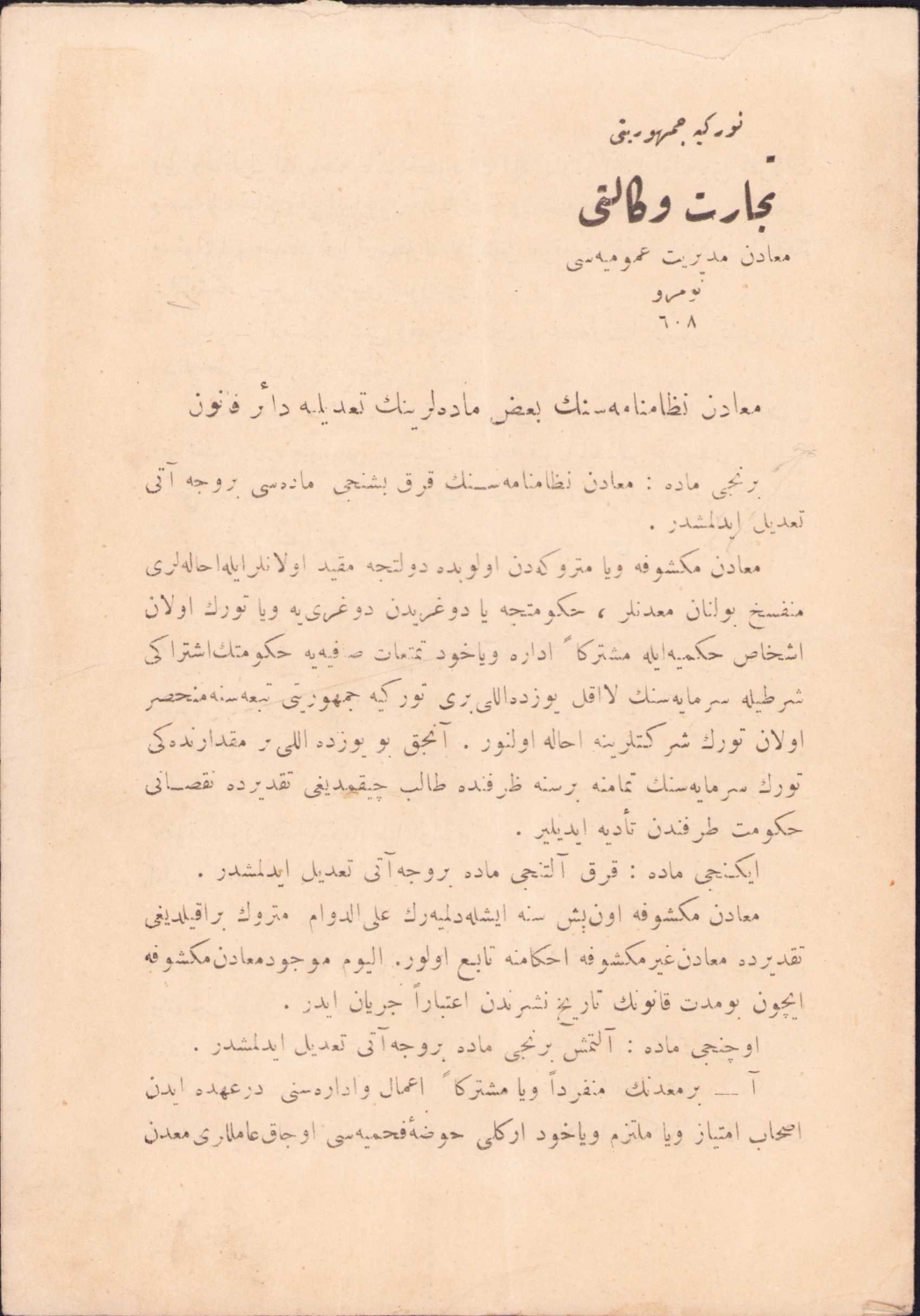 Osmanlı Türkiye Cumhuriyeti Ticaret Vekaleti Maden Müdüriyeti Umumiyesi antetli maden nizamnamesinin bazı maddelerine dair kanun, 8 sayfa, 14x20 cm