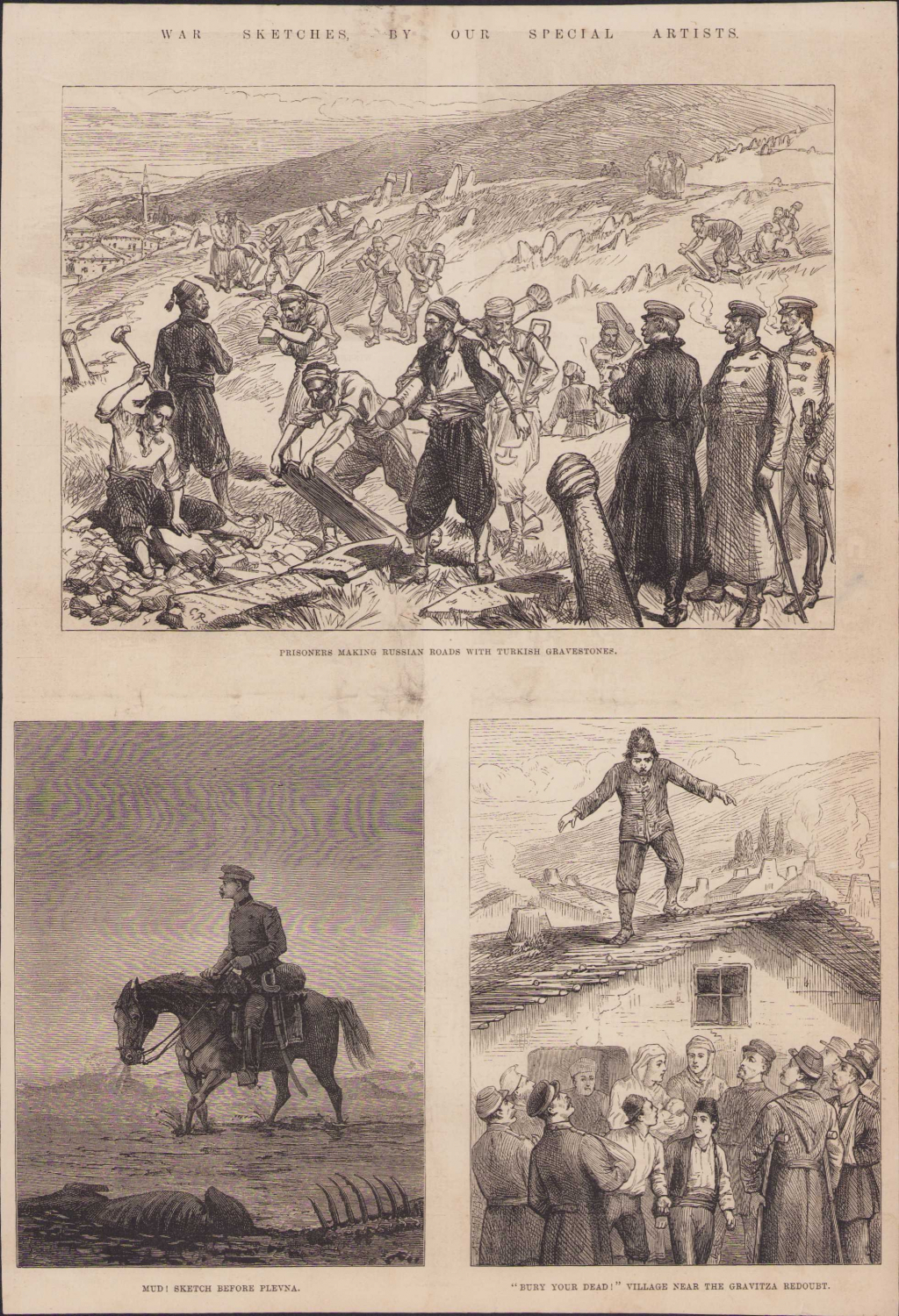Savaş eskizleri, Rusların Türk savaş esirlerine mezartaşlarını kırdırarak yol yaptırma sahnesi, Ölüleri gömün çağrısı ve çamura saplanan süvari görselli, 1877 dergiden kesilmiş, 25x37 cm