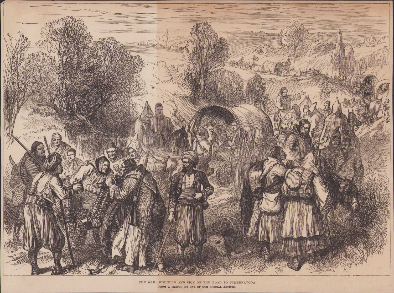 Balkan cephesinden kaçan yaralı ve hasta Türkler, eskiz, İngilizce yazılı, 1877 dergiden kesilmiş, 30,5x23,5cm