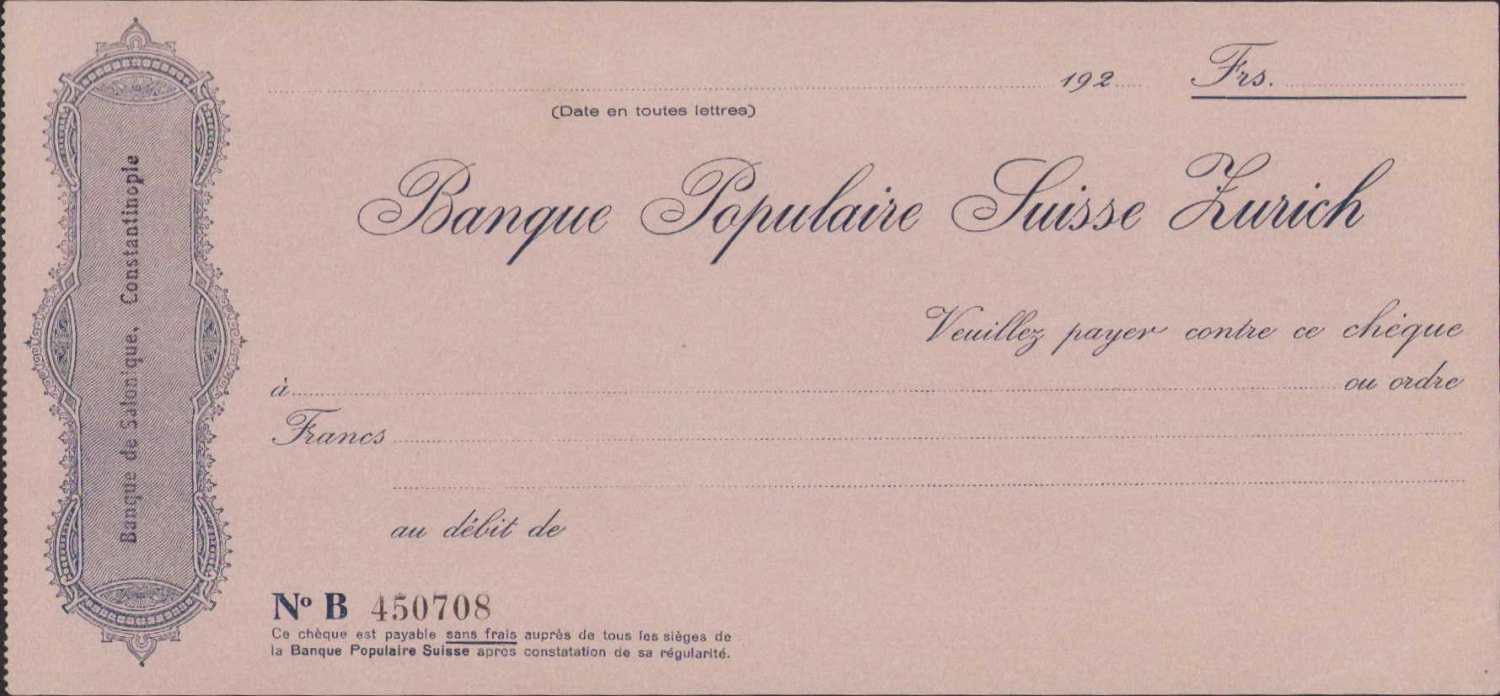 Banque Populaire Suisse Bankası Selanik Bankası Constantinople çek yaprağı, 1920'ler, 10,5x22,5 cm