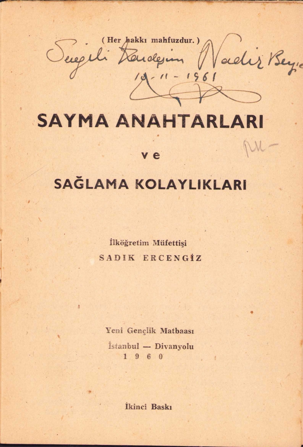 İlkokul Öğrencileri için Sayma Anahtarları ve Sağlama Kolaylıkları, Sadık Ercengiz, Yeni Gençlik Matbaası, 1960, ikinci baskı, yazarından imzalı, 16 sayfa, 14x20 cm