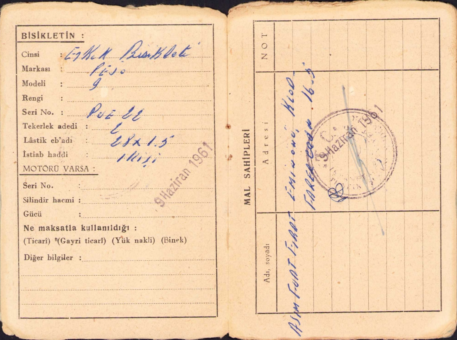 Bisikletlere mahsus sicil cüzdanı, İstanbul, 1961, kapak haliyle, 7x11 cm