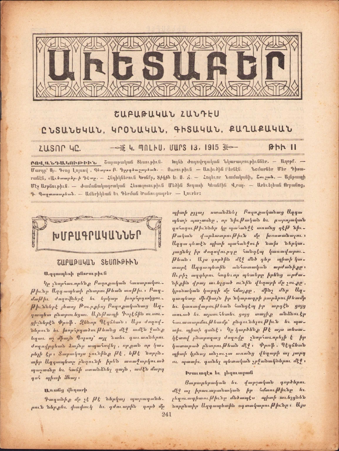 Ermenice mecmua, 1915, cilt çıkması, 23 sayfa,19x25 cm