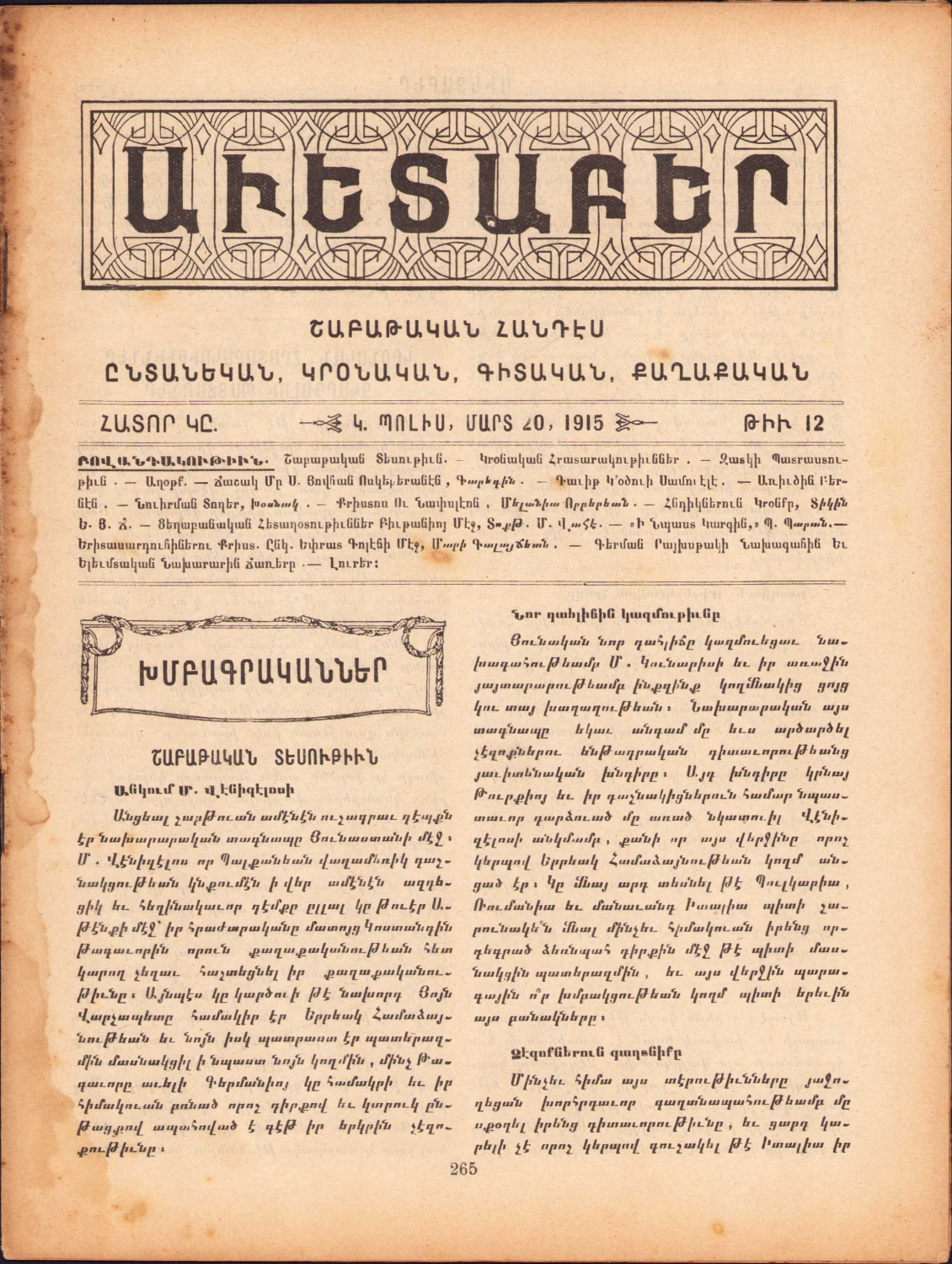 Ermenice mecmua, 1915, cilt çıkması, 23 sayfa,19x25 cm