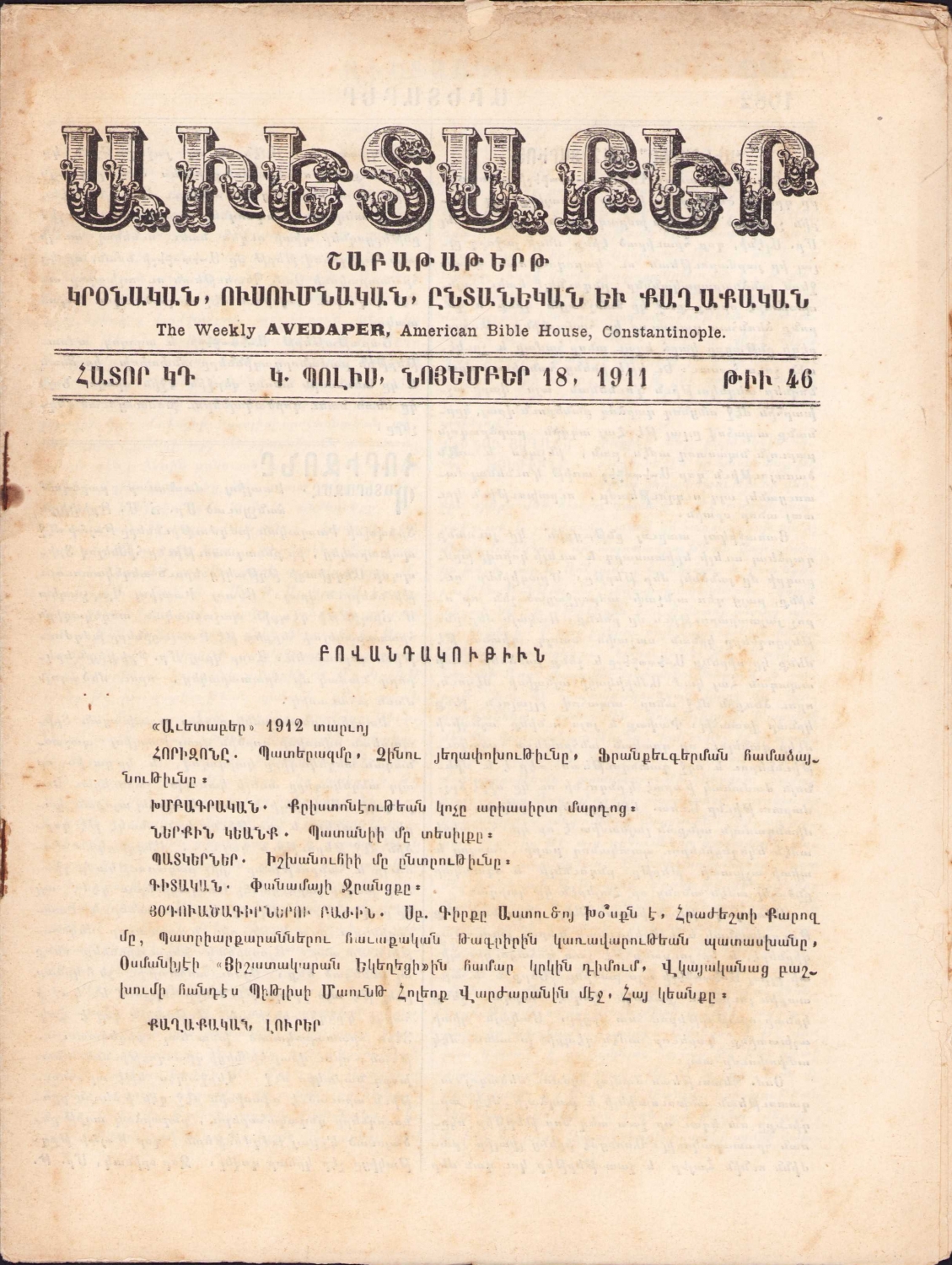 Avedaper, Ermenice mecmua, American Bible House 1911, cilt çıkması, 23 sayfa,19x25 cm