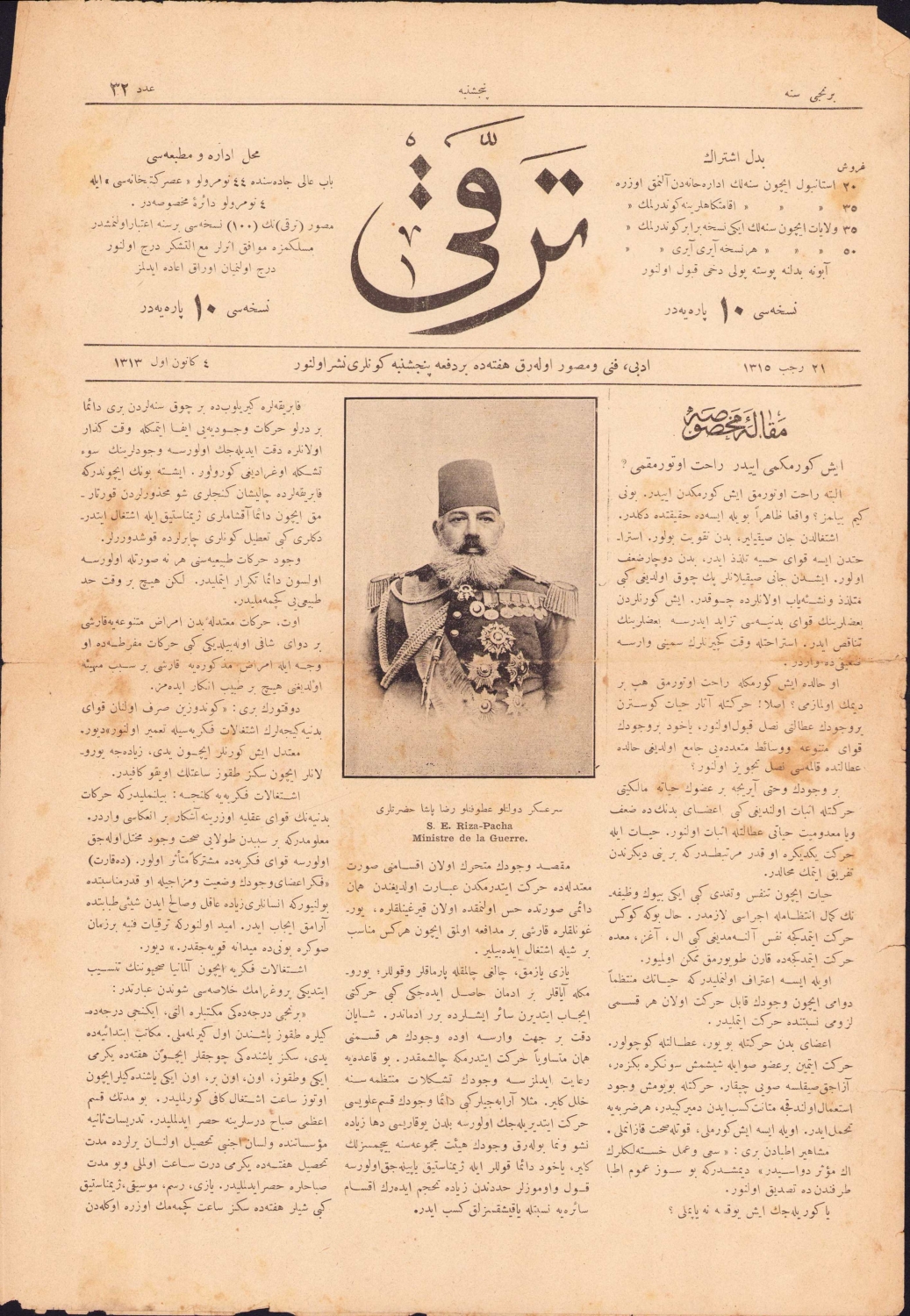 Osmanlıca Terakki Gazetesi, 1313, Serasker Ali Rıza Paşa görselli, 4 sayfa, 28x40 cm