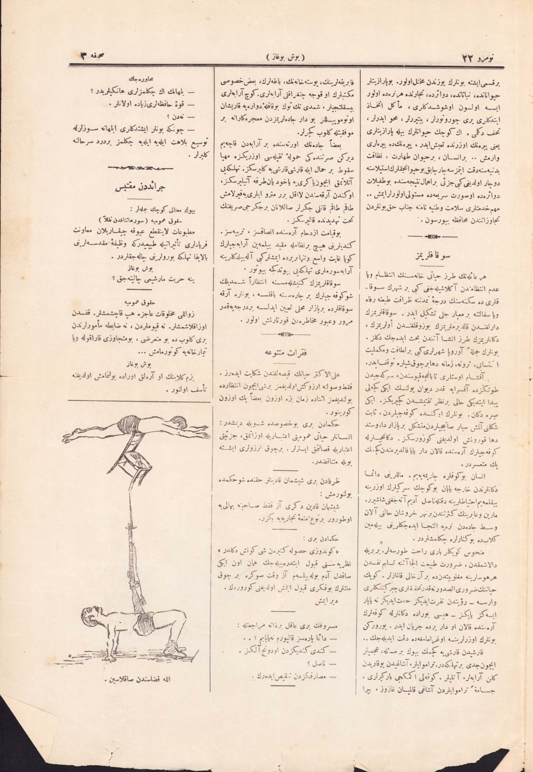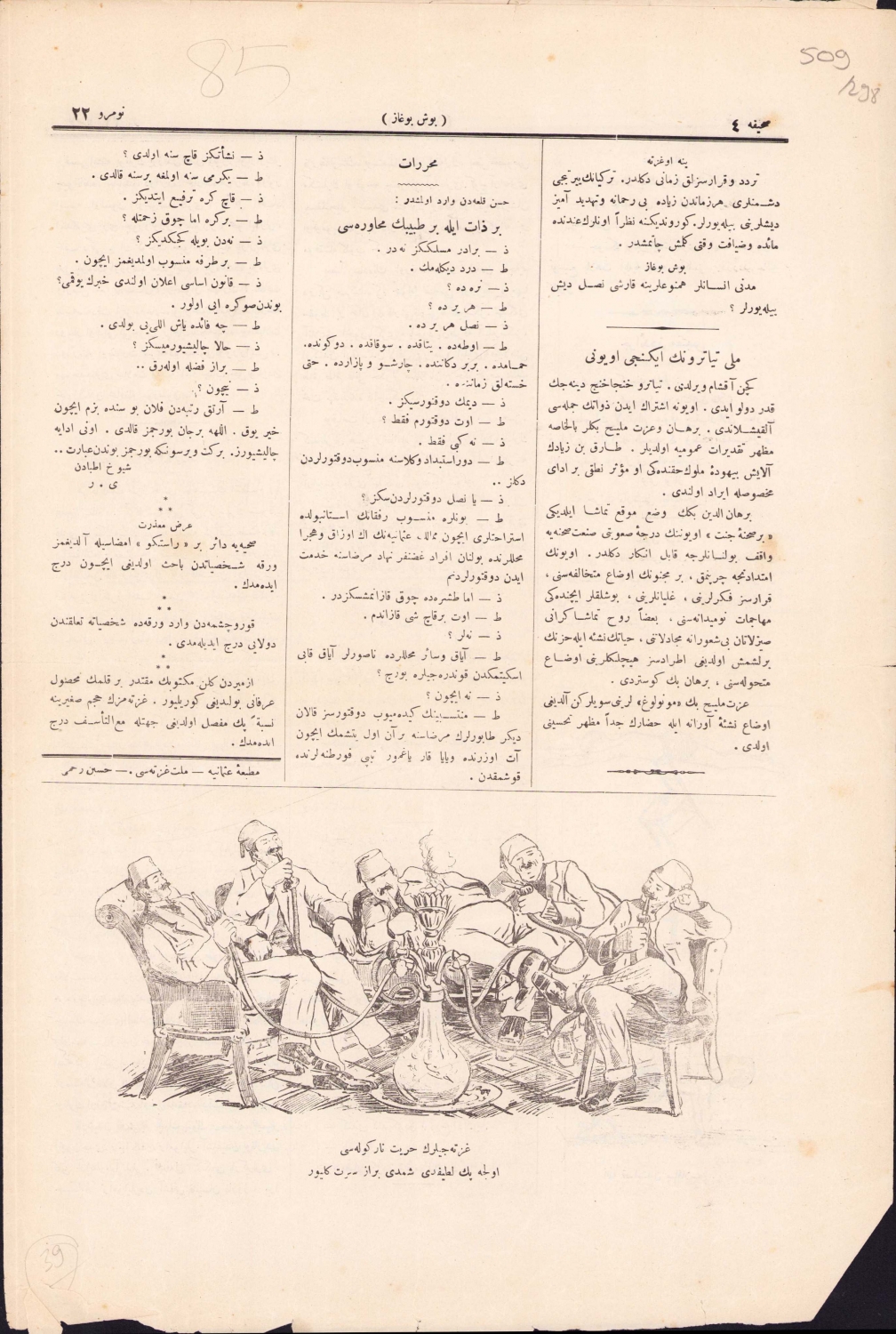 Osmanlıca Boşboğaz ile Güllabi mizah mecmuası, 1324 tarihli, bir kenar haliyle, 4 sayfa, 28x40 cm