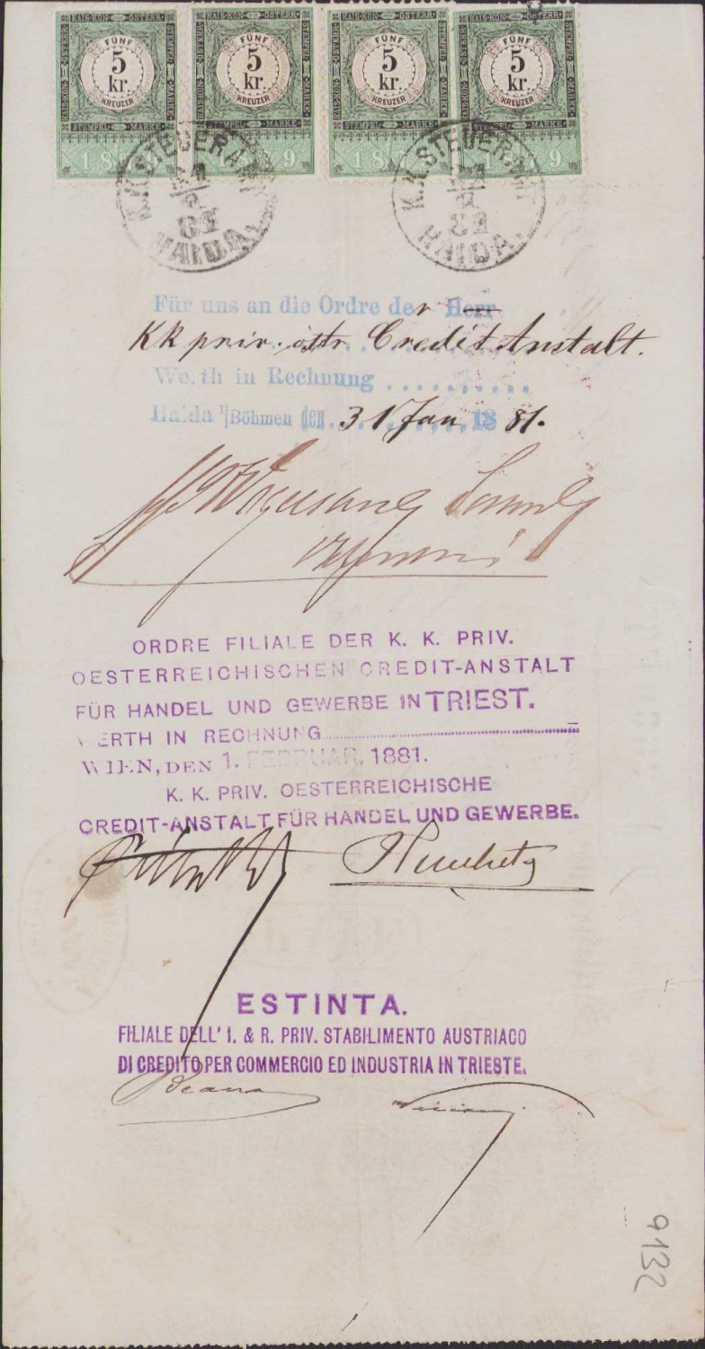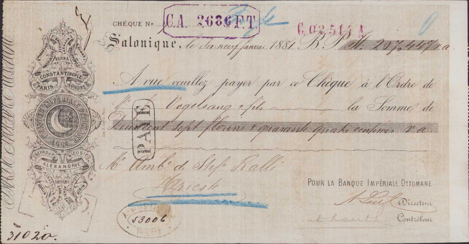 Osmanlı Bankası Selanik Şubesi çeki, 1881 tarihli, pullu, mühürlü, 25,5x13,5 cm