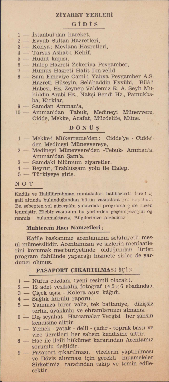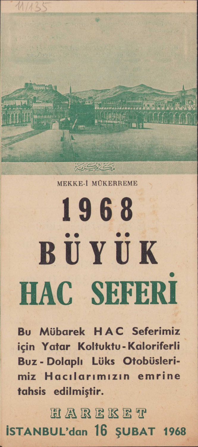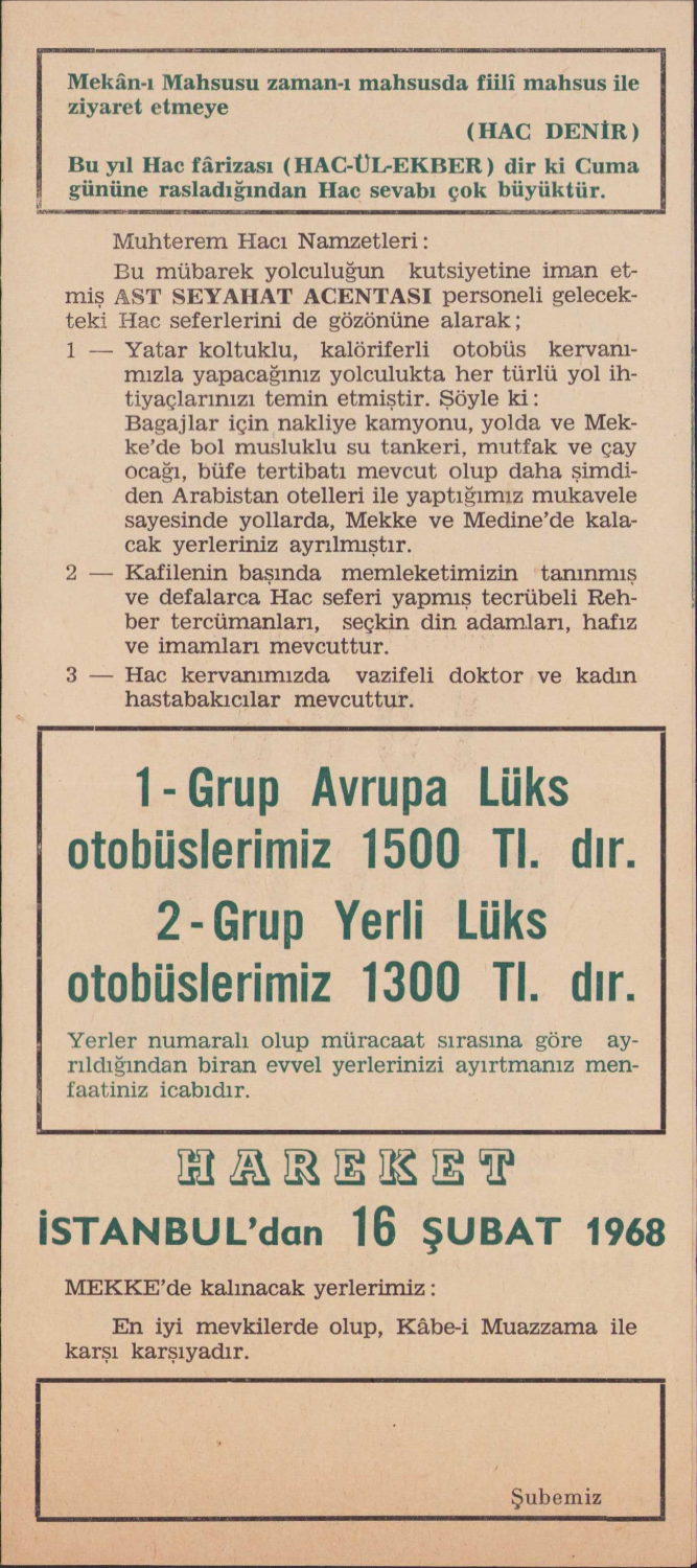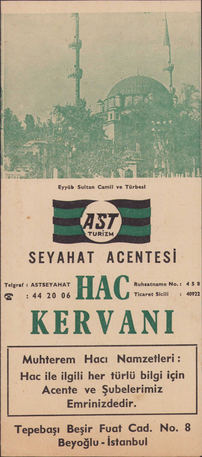 Hac Kervanı tanıtım broşürü, Mekke-i Mükerreme ve Eyüp Sultan Camii görselli, AST Turizm, 2 yaprak, 4 sayfa, 1968 tarihli, İstanbul adresli