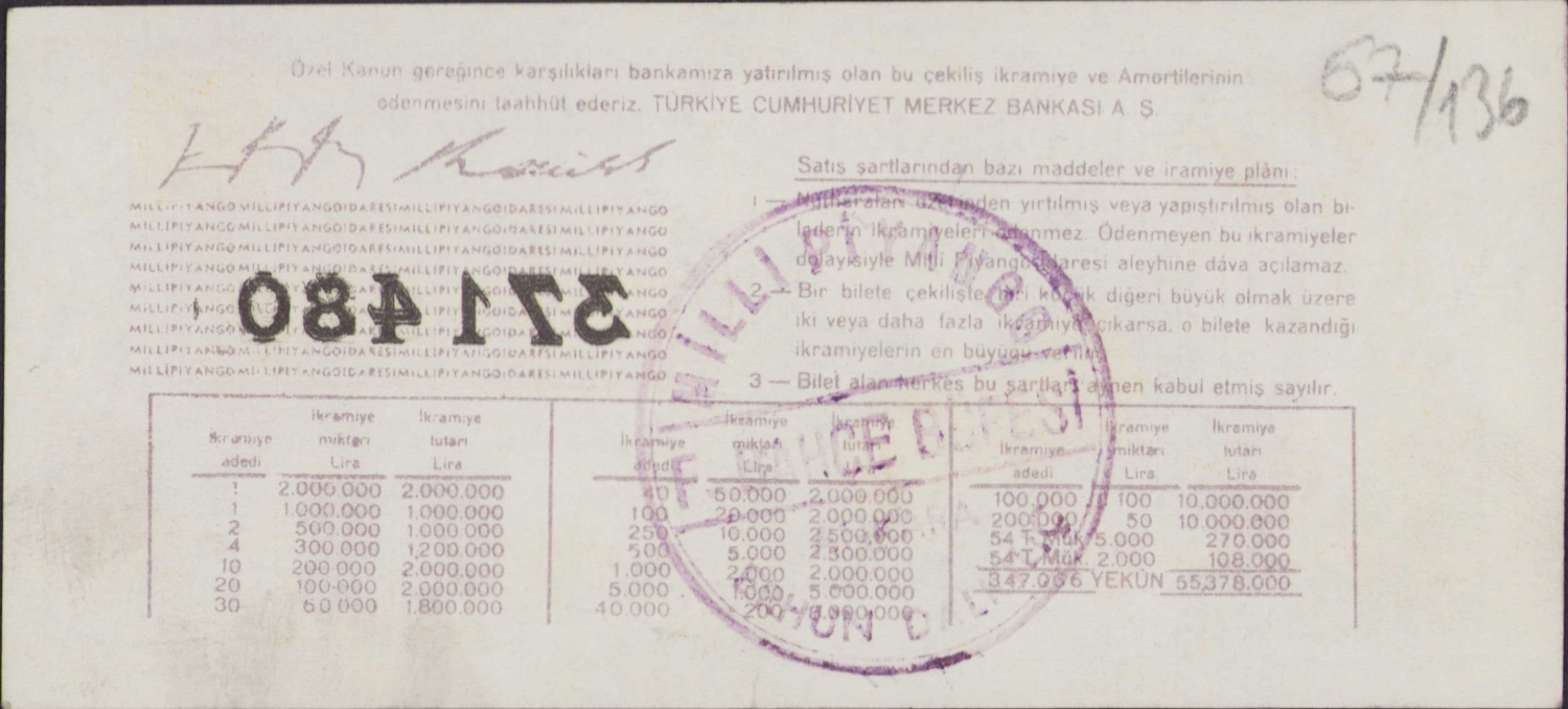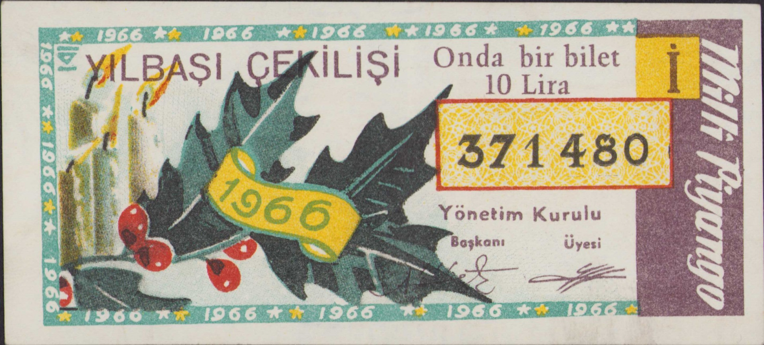 Milli Piyango yılbaşı bileti, 10 lira, 10'da 1 oranında, 1966 tarihli, Fenerbahçe Büfesi mühürlü