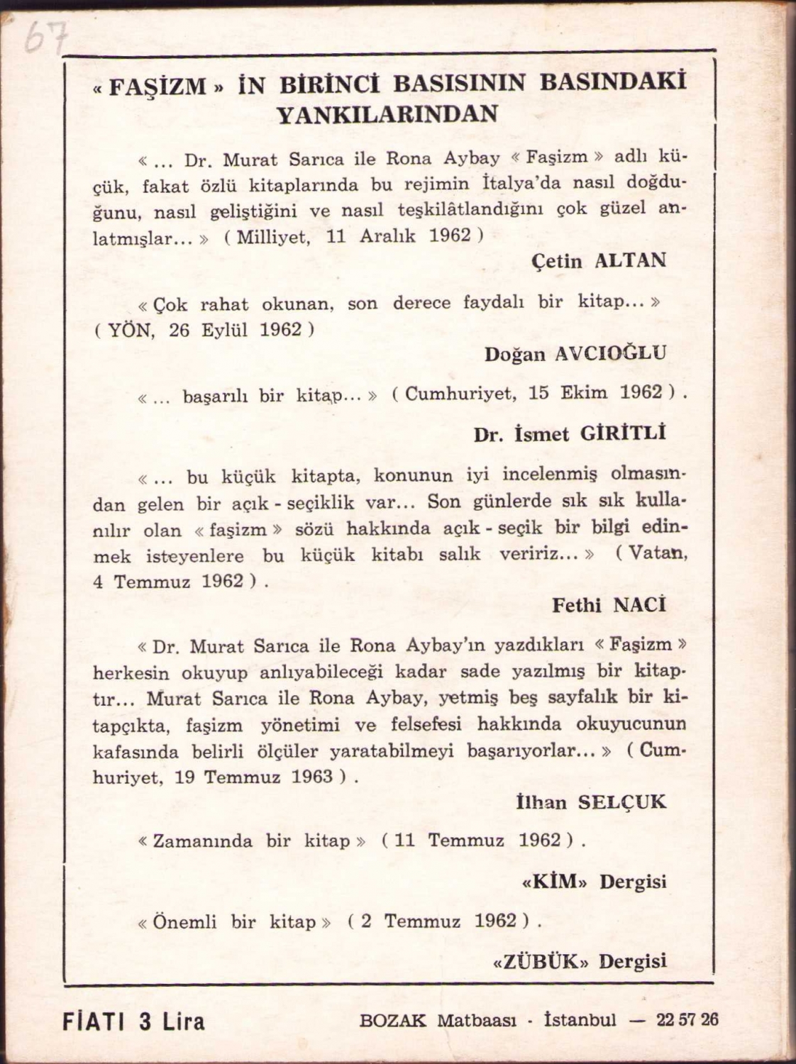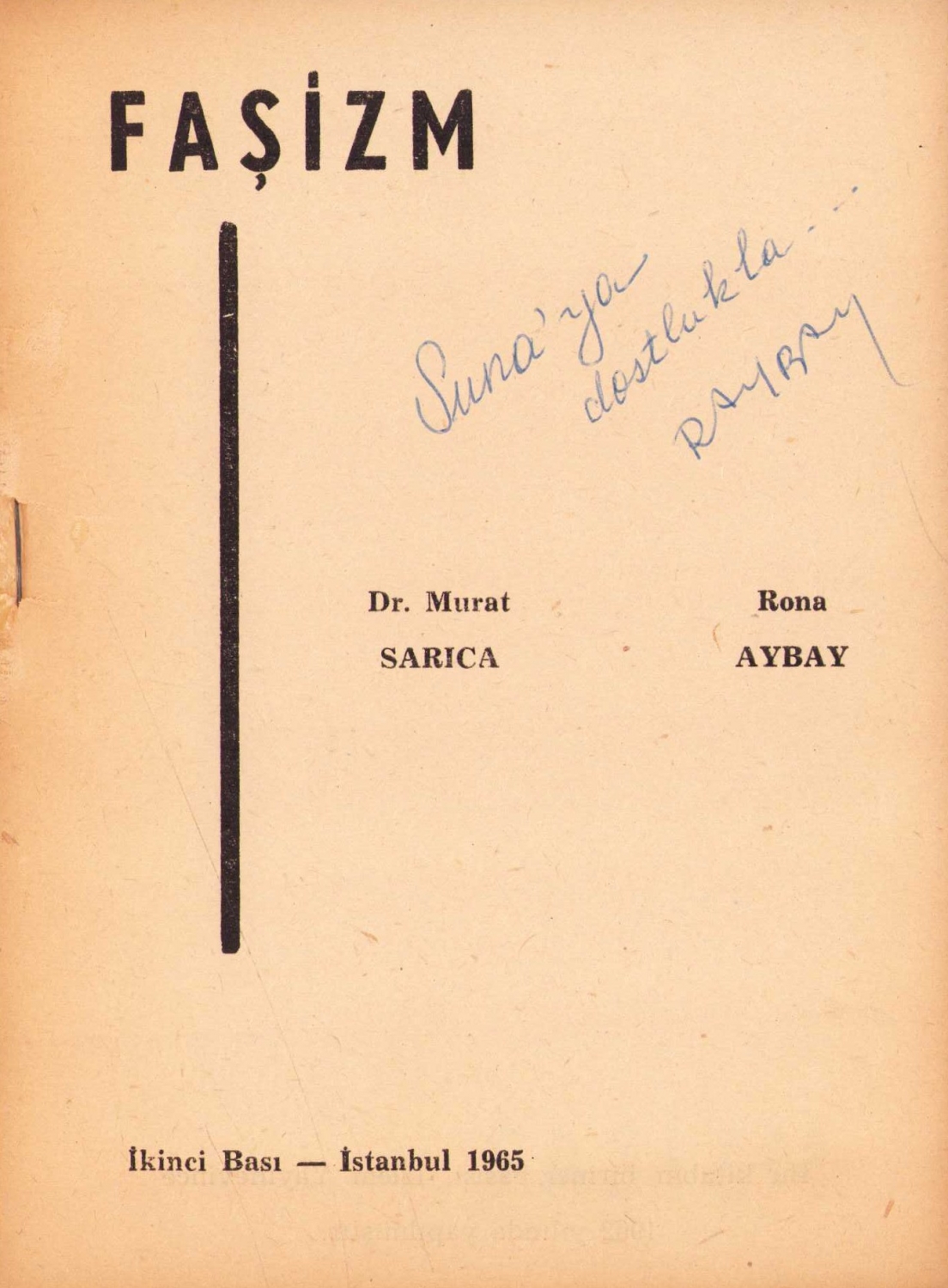 Faşizm, Dr. Murat Sarıca, Rona Aybay, ikinci baskı, İstanbul, 1965, Rona Aybay'dan ithaflı imzalı,76 sayfa, 11x15 cm