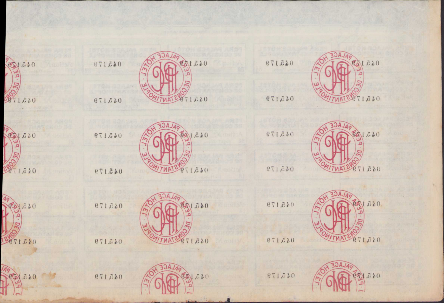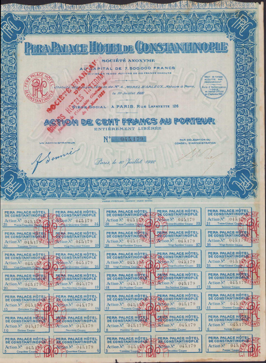 Pera Palas Hoteli hisse senedi, 100 franklık, 1922 tarihli, Constantinople adresli,32x41cm