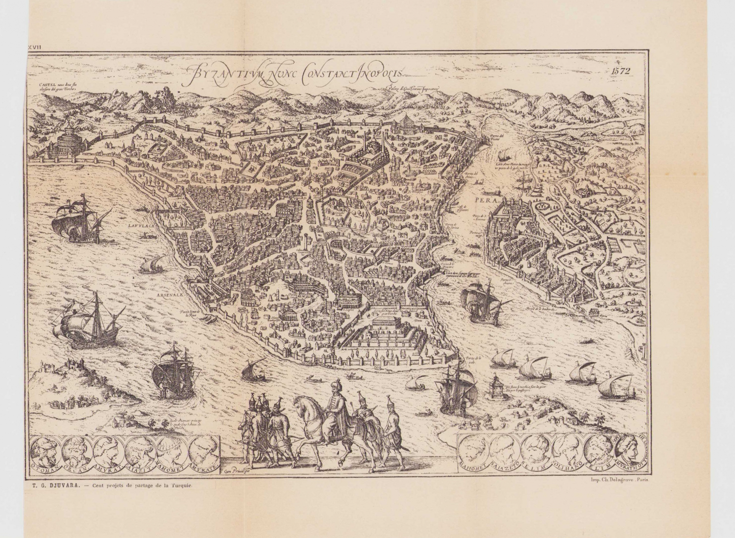 Bizans'tan Constantinople'a, Latince yazılı, baskı gravür İstanbul Yarımadası haritası, Osmanlı Padişahları görselleriyle, 35x28 cm