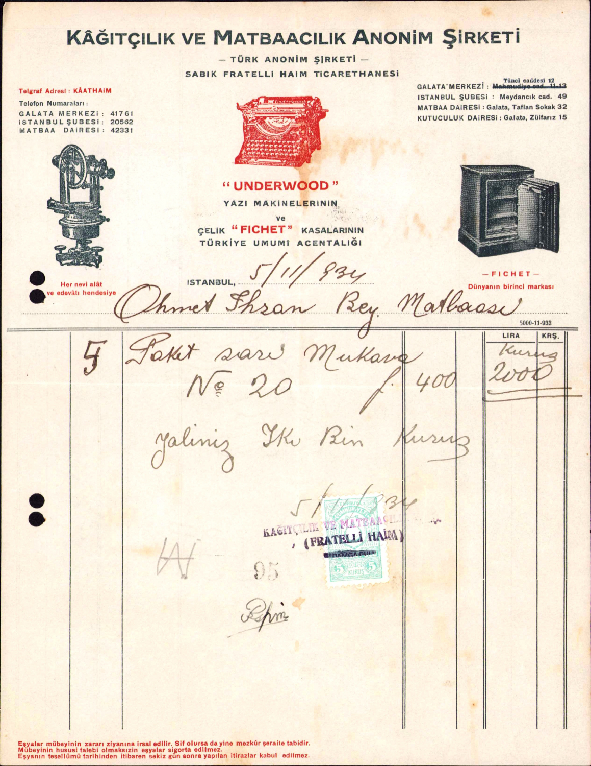 Kağıtçılık ve Matbaacılık Anonim Şirketi antetli fatura, 1934 tarihli, Galata Tünel caddesi adresli, pullu, 21,5x28 cm