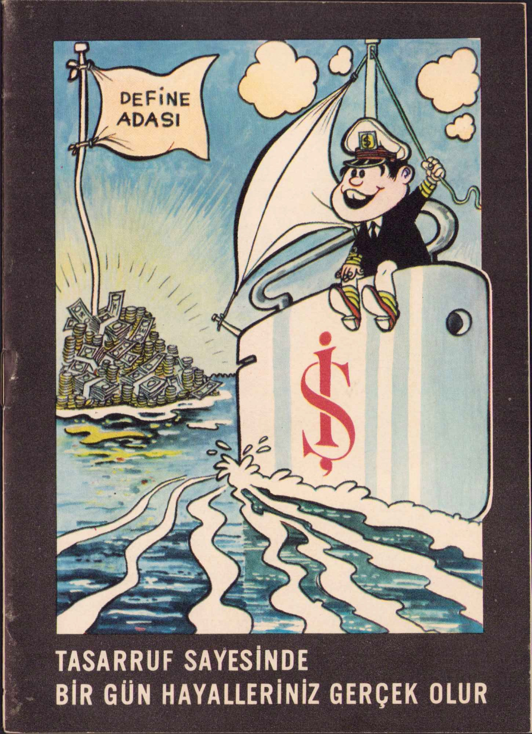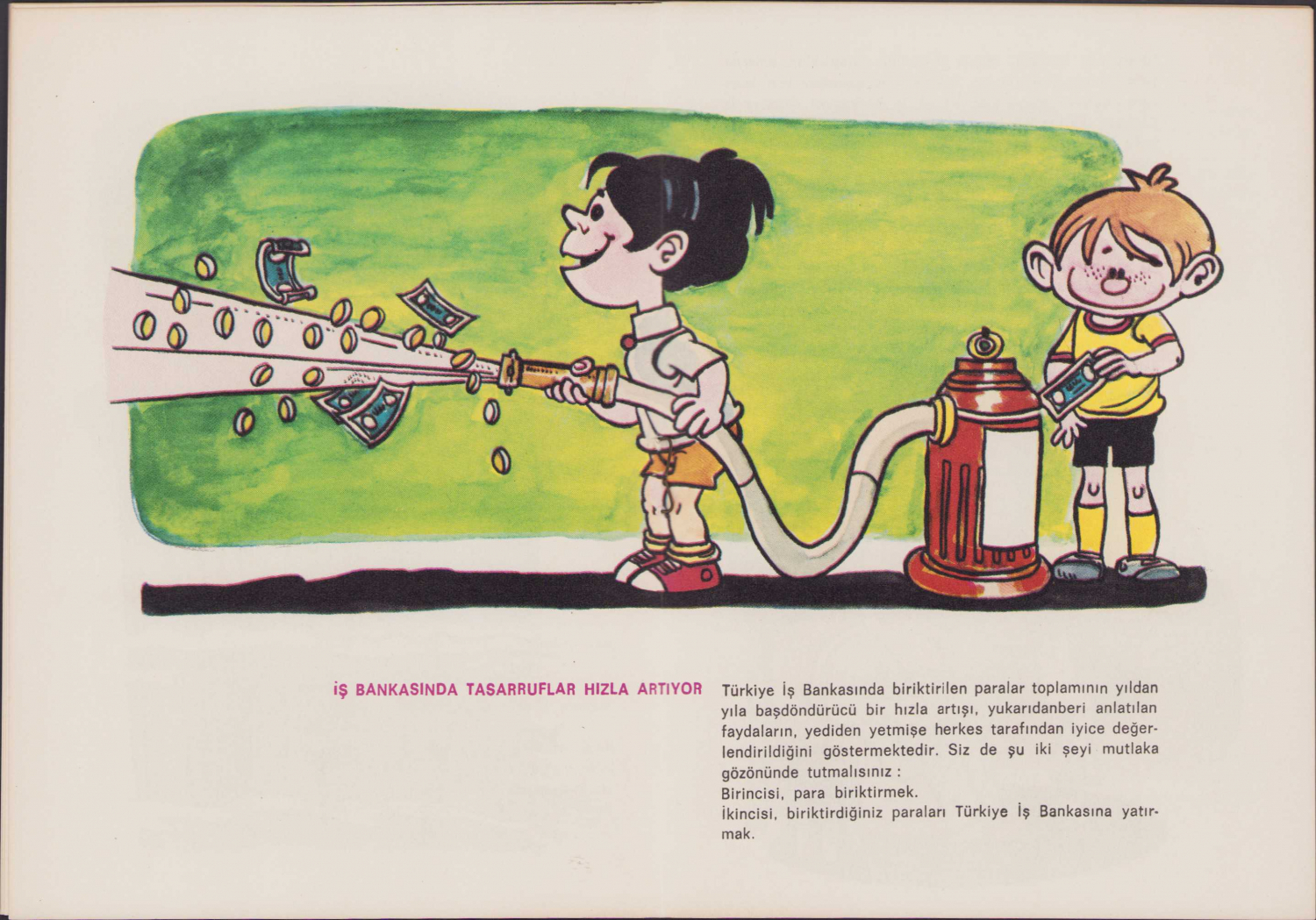 İş Bankası çocuklara yönelik hazırladığı kumbara ve tasaruuf temalı kitapçık, 14 sayfa, Doğuş Matbaası baskısı