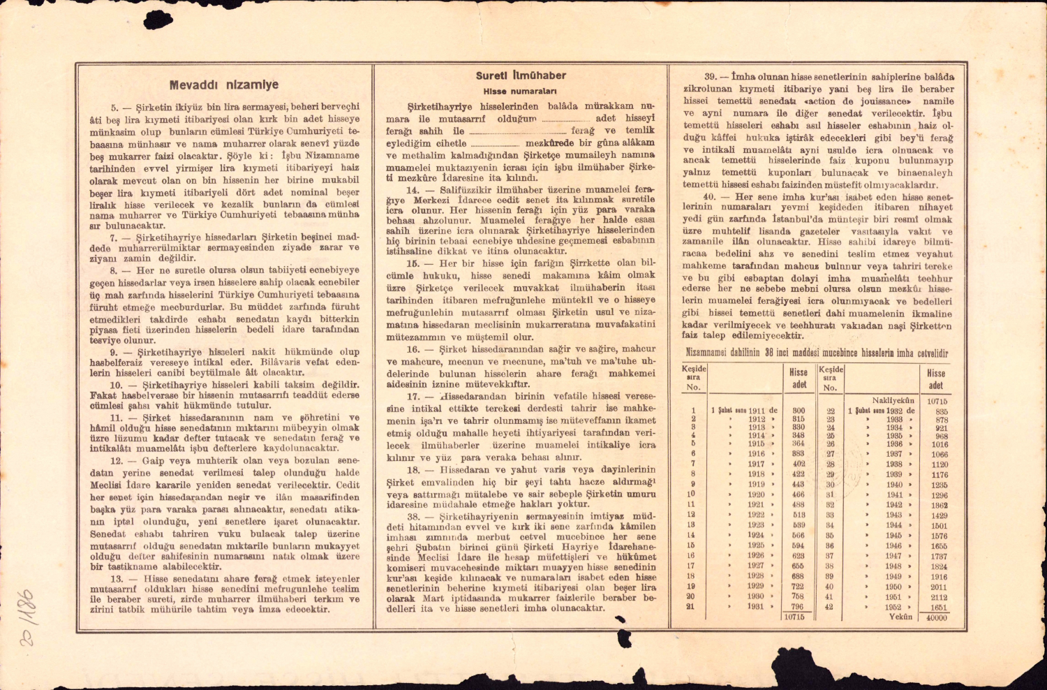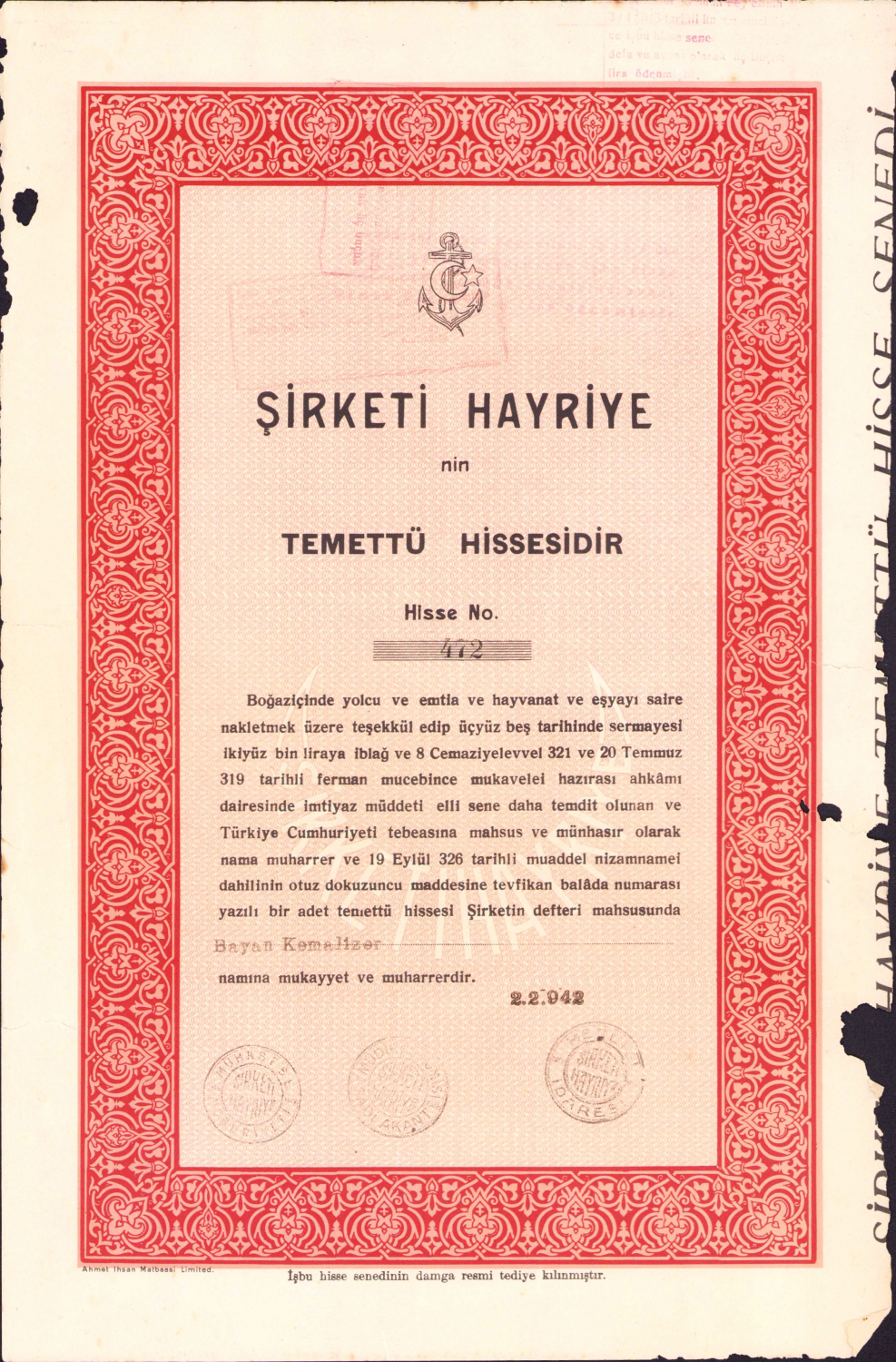 Şirketi Hayriye'nin Temettü Hissesi, 1942 tarihli, Ahmet İhsan Matbaası baskısı, 25x39 cm, haliyle