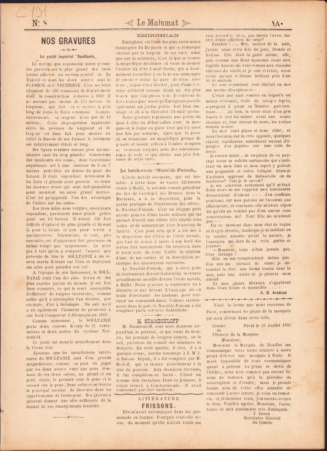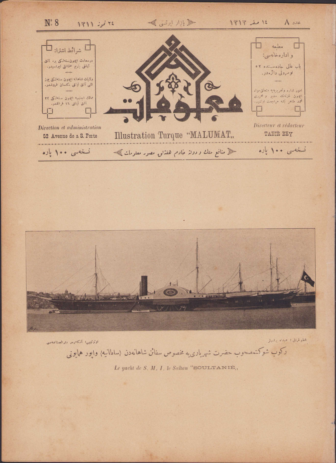 Malumat Dergisi, Müdür ve Muharriri Mehmet Tahir Bey, Sultaniye Vapur-u Hümayun kapaklı, 1895 tarihli, Osmanlıcave Fransızca iki dilli, 23x32