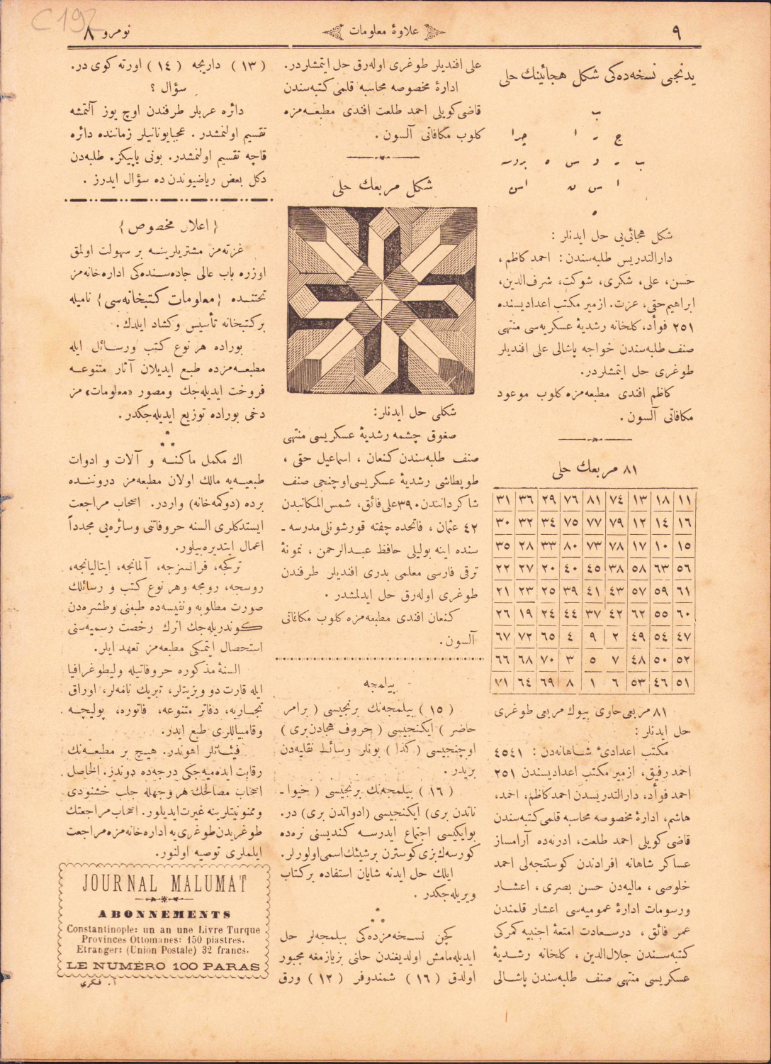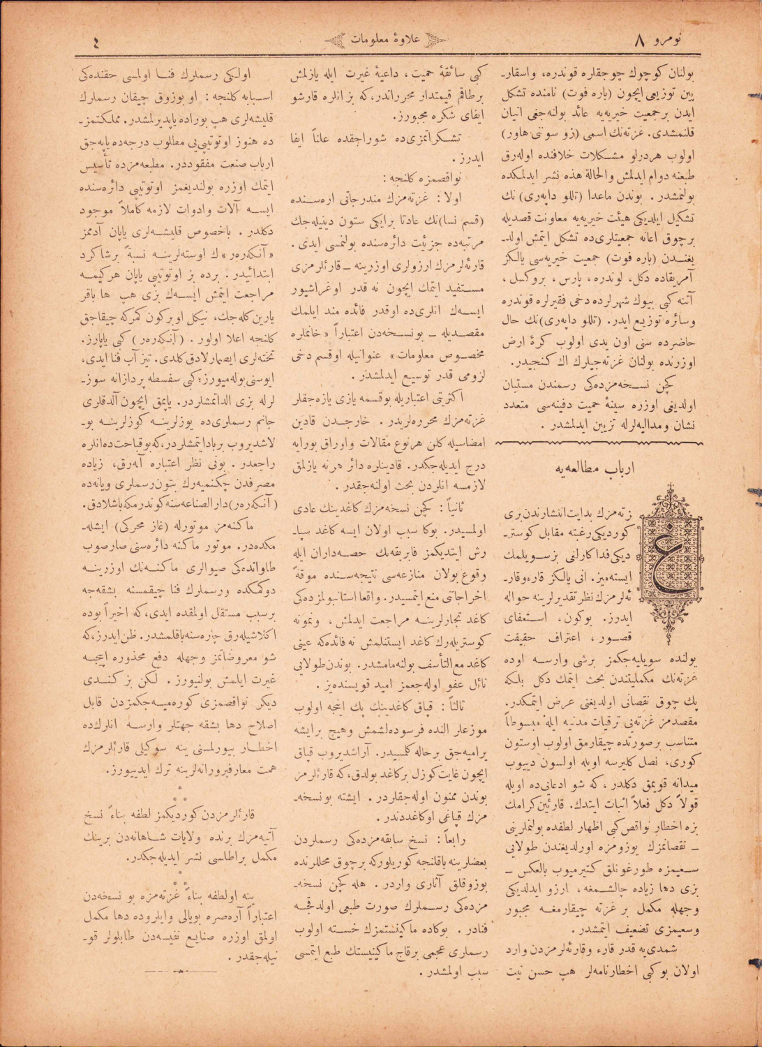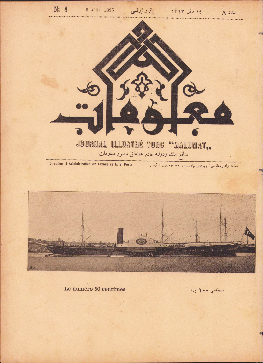 Malumat Dergisi, Müdür ve Muharriri Mehmet Tahir Bey, Sultaniye Vapur-u Hümayun kapaklı, 1895 tarihli, Osmanlıcave Fransızca iki dilli,1-9 sayfa, 8. sayı, 23x32