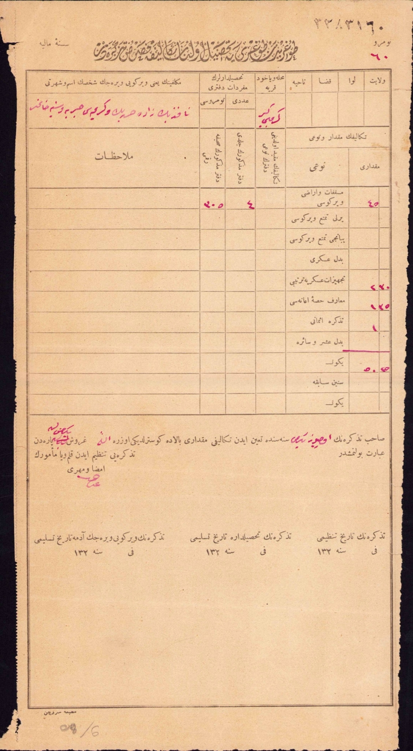 Osmanlı Doğrudan doğruya tahsil olunan mükellefe mahsus tezkere, Nazif Bey Zade Hasan Bey kerimesi, 1320, 18x36 cm