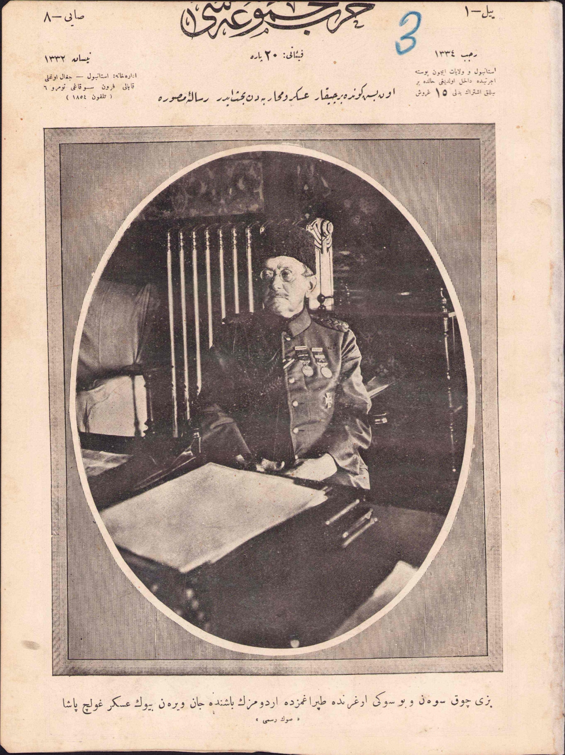 Osmanlıca Harp Mecmuası, 1332 "Bize Çok Seven Bu Sevgi Uğrunda Toprağımızda Ordumuzun Başında Can Veren Büyük Asker Golç (Goltz) Paşa", 16 sayfa, 22x30 cm