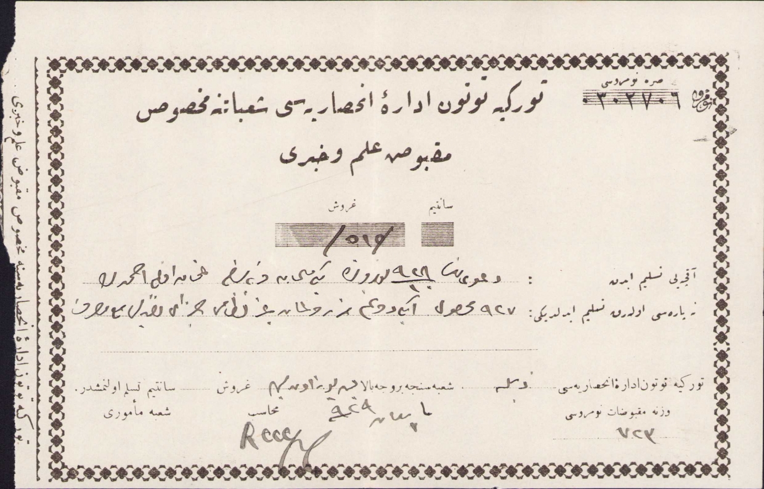 Osmanlıca Türkiye Tütün İnhisarına mahsus Makbuz ilmühaberi, 1929, 19x113 cm