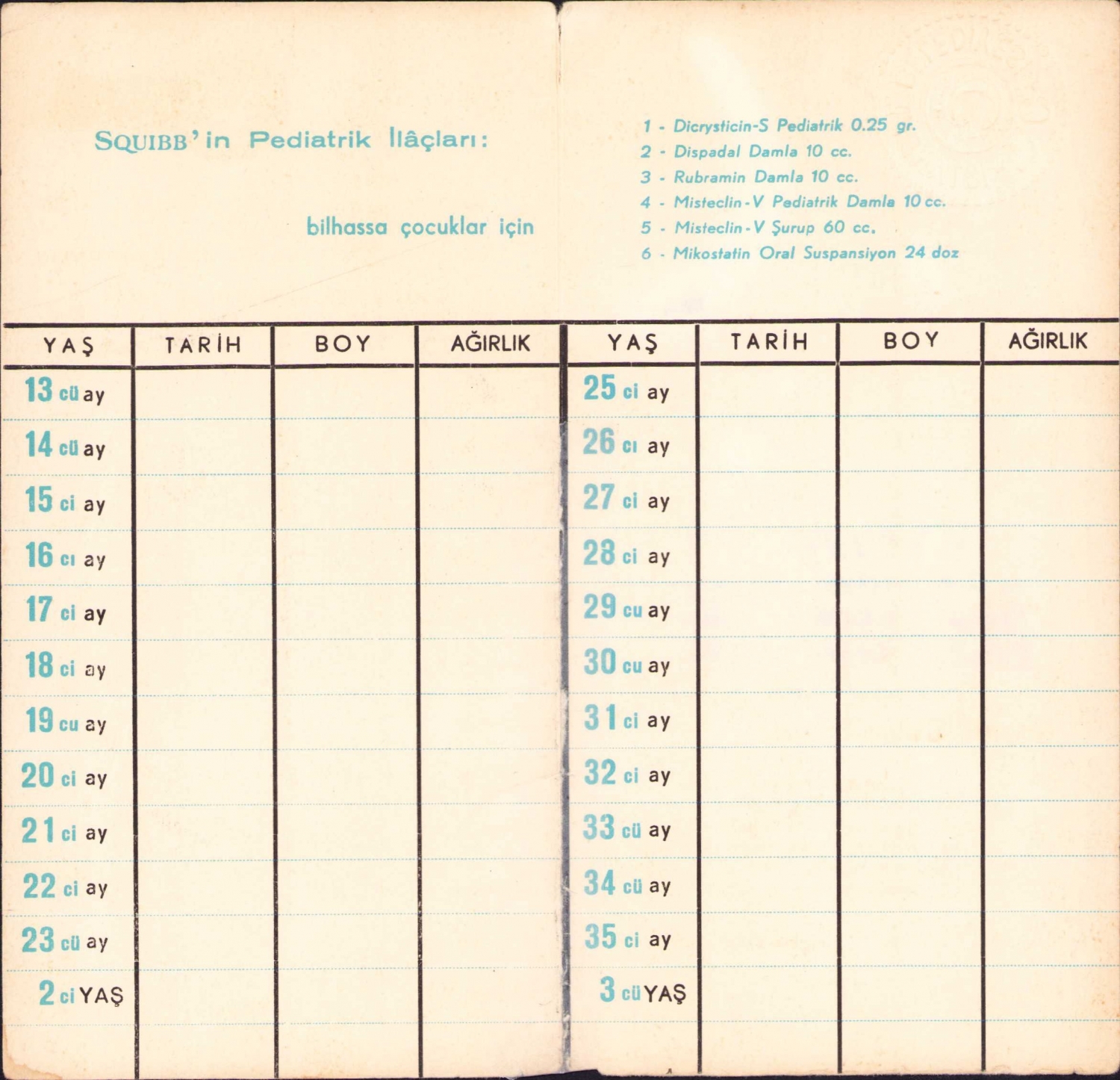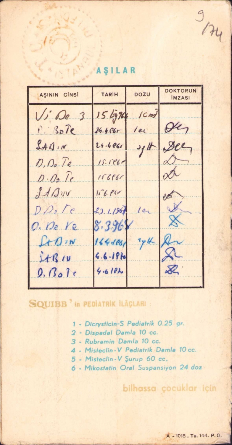 Squibb antetli aşı kartı, T.C. İstanbul Belediyesi, 1964, 19x19 cm