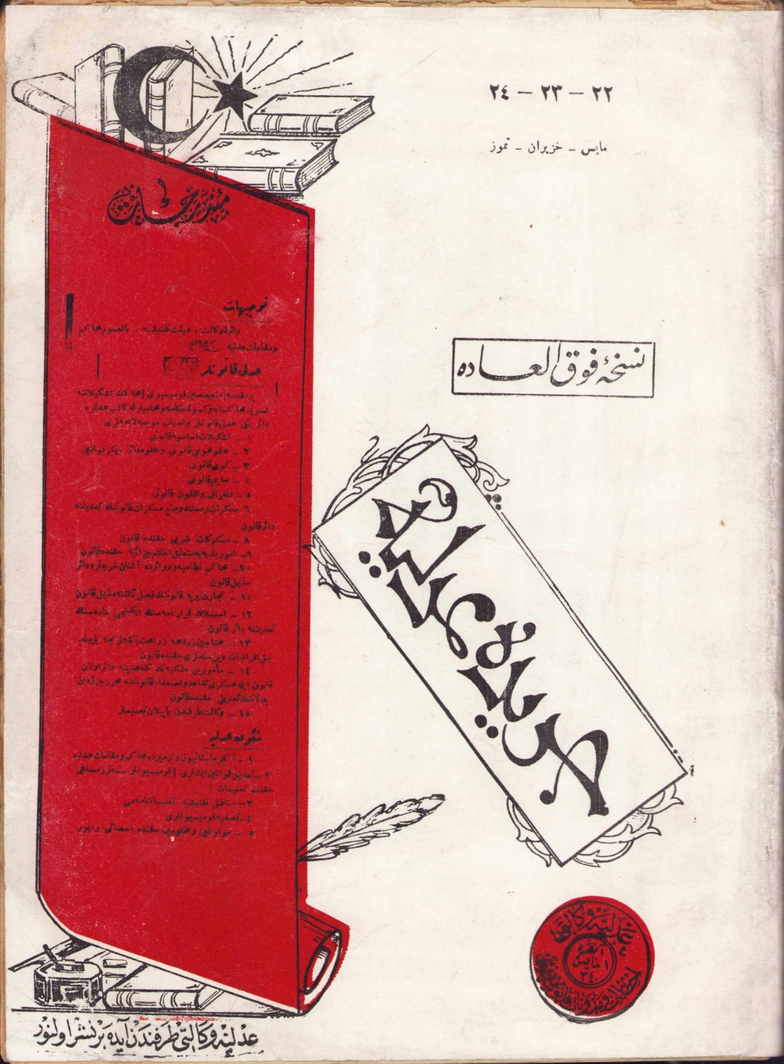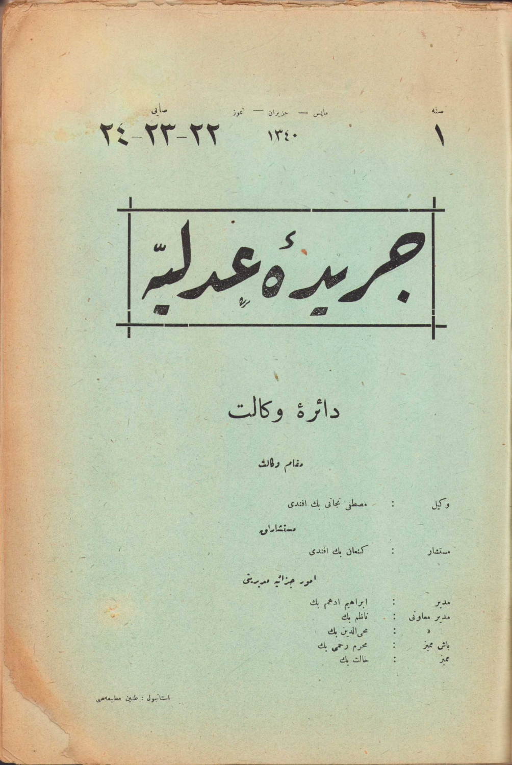 Osmanlıca Ceride-i Adliye mecmuası, 22-23-24. sayılar, Tanin Matbaası, İstanbul, 1340, 180 sayfa, 20x28 cm