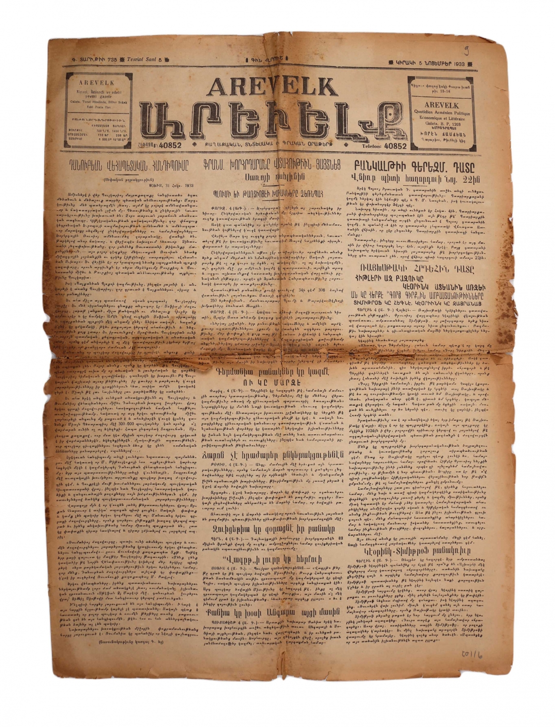 Ermenice Arevelk gazetesi, 1933, haliyle, 4 sayfa, 40x56 cm