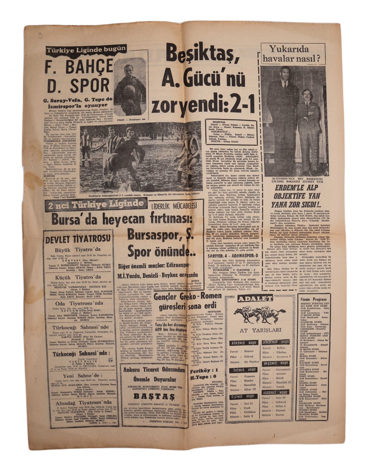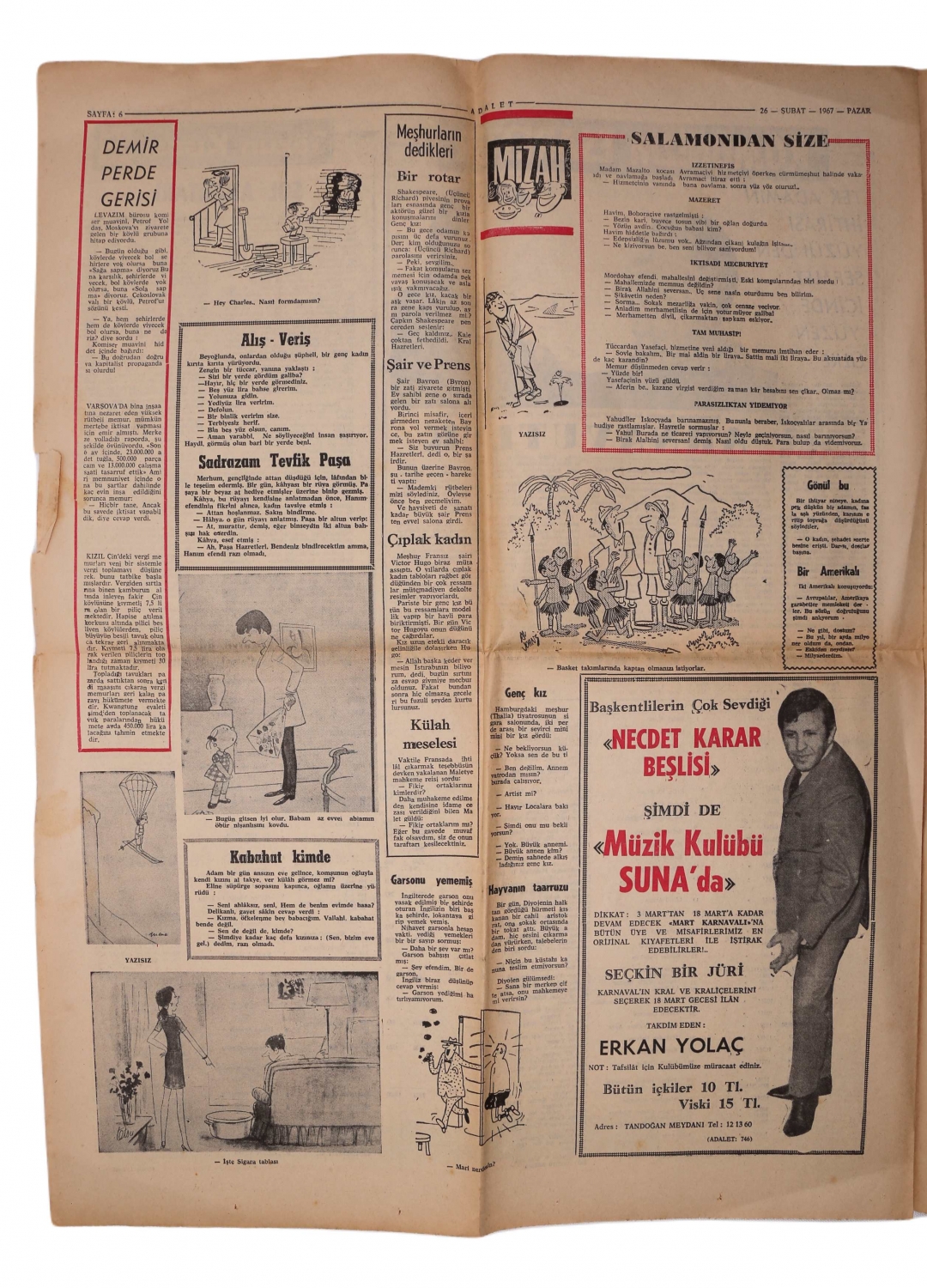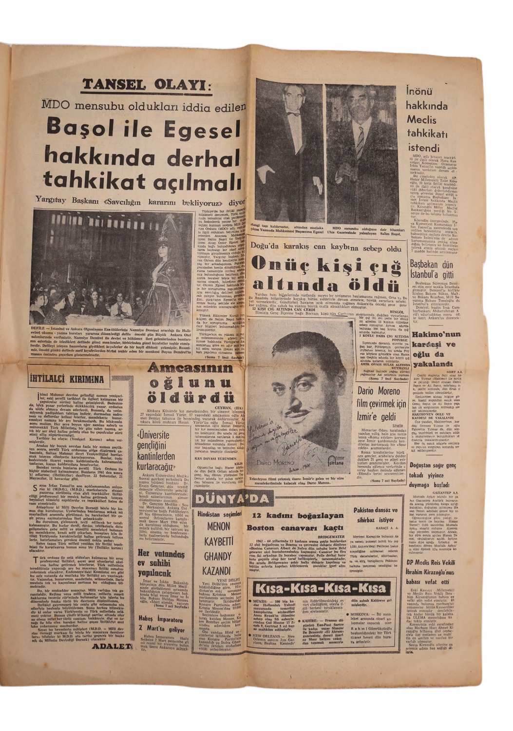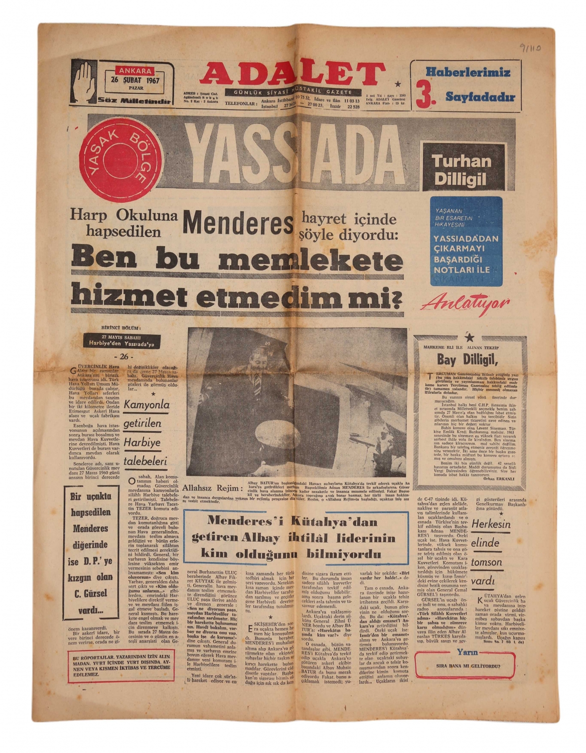 Adalet gazetesi, 1967, manşetler " Yassıada" "Harb Okuluna Hapsedilen Menderes hayret içinde şöyle diyordu: Ben Bu Memlekete Hizmet Etmedim mi?" 8 sayfa, 42x56 cm