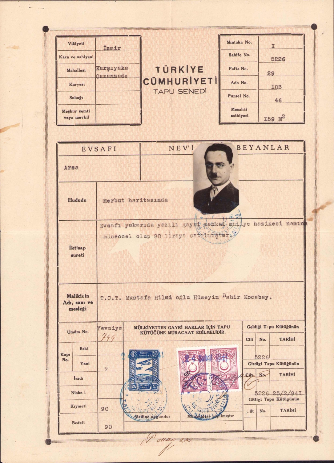 Tapu Senedi, İzmir, Karşıyaka, 1941, 20x28 cm