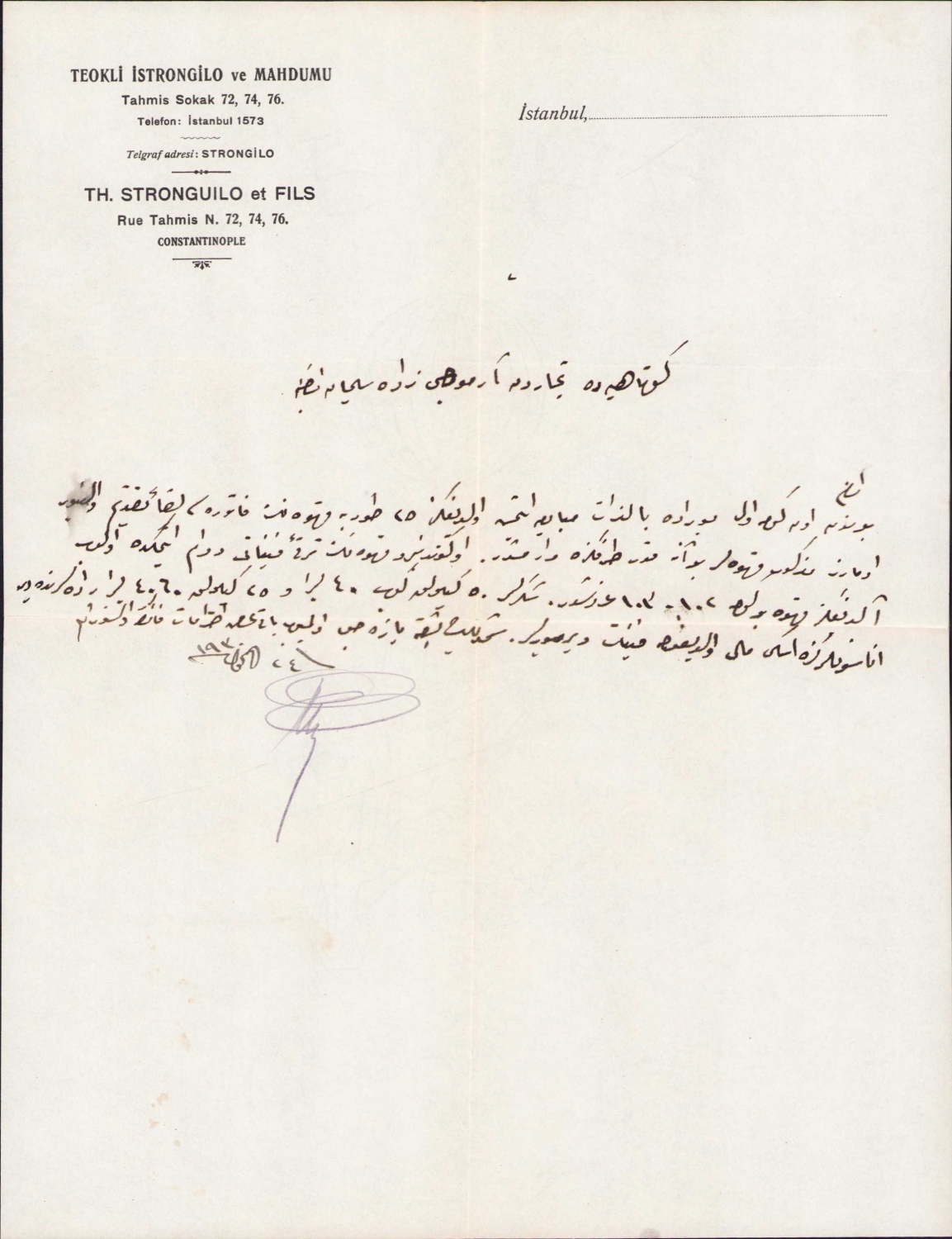 Fransızca - Türkçe Teokli İstrongilo ve Mahdumu antetli Osmanlıca yazılı doküman, 1930, 21x27 cm