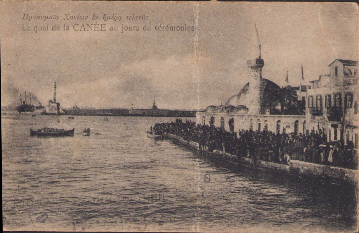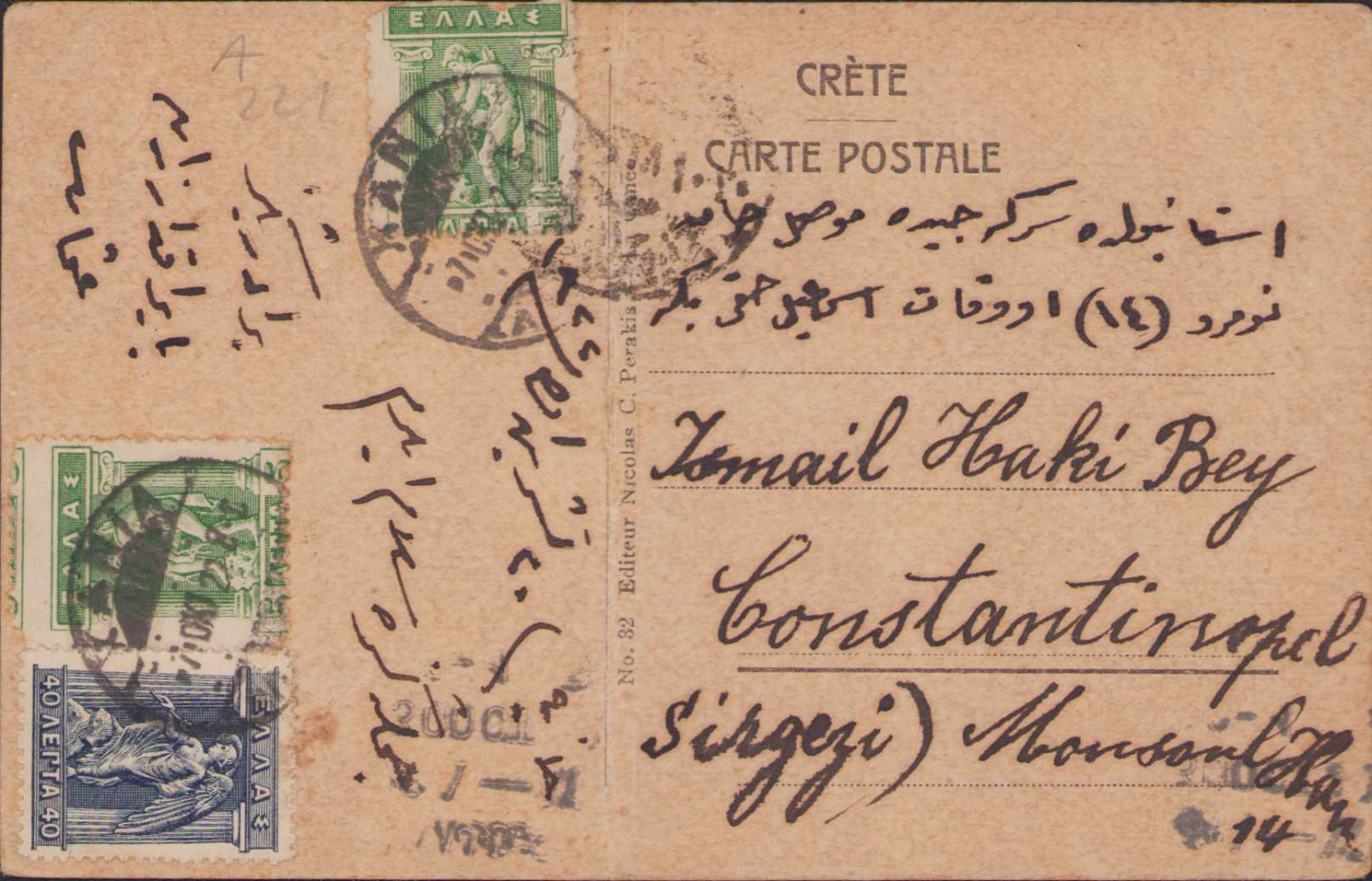 Osmanlı dönemi Girit, 'Tören günlerinde Yanya Rıhtımı' yazılı, Fransızca-Osmanlıca yazılı, pullu, postadan geçmiş, İsmail Hakkı bey'e gönderilmiş, Constantinople