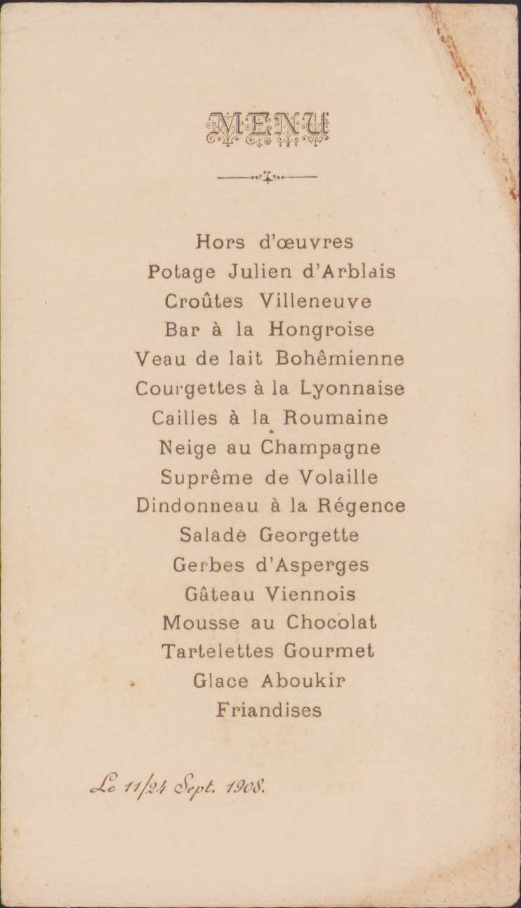 Osmanlı dönemi, 11 Eylül 1908 tarihli ait Fransızca Menü, 10x16,5