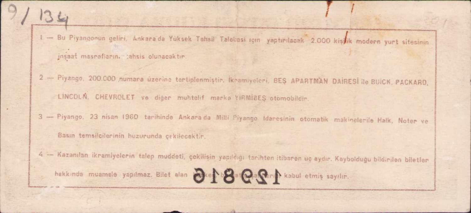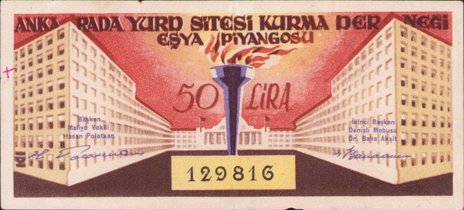 Ankara Yurd Sitesi Kurma Derneği eşya piyango bileti, 1960, 15x7 cm