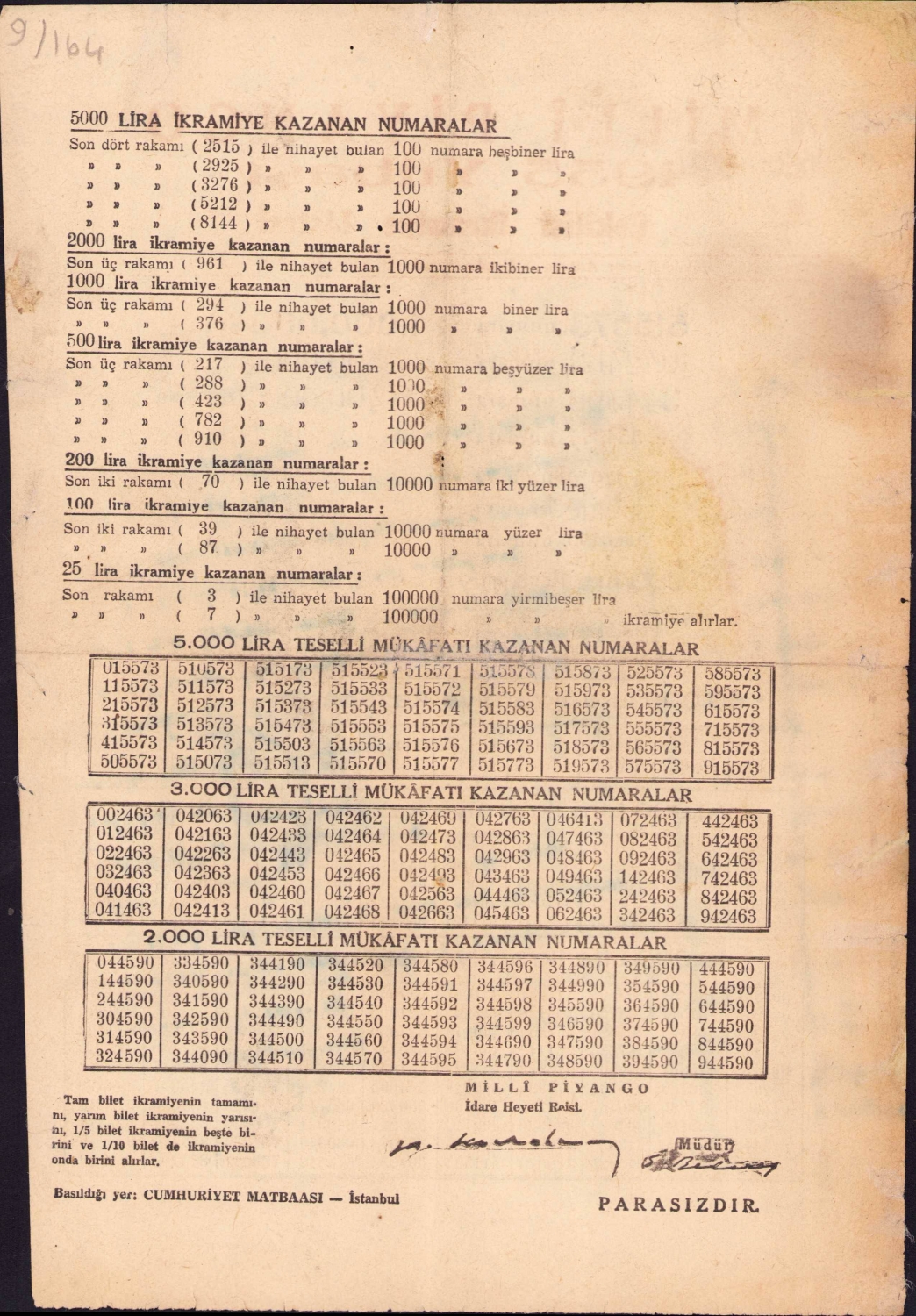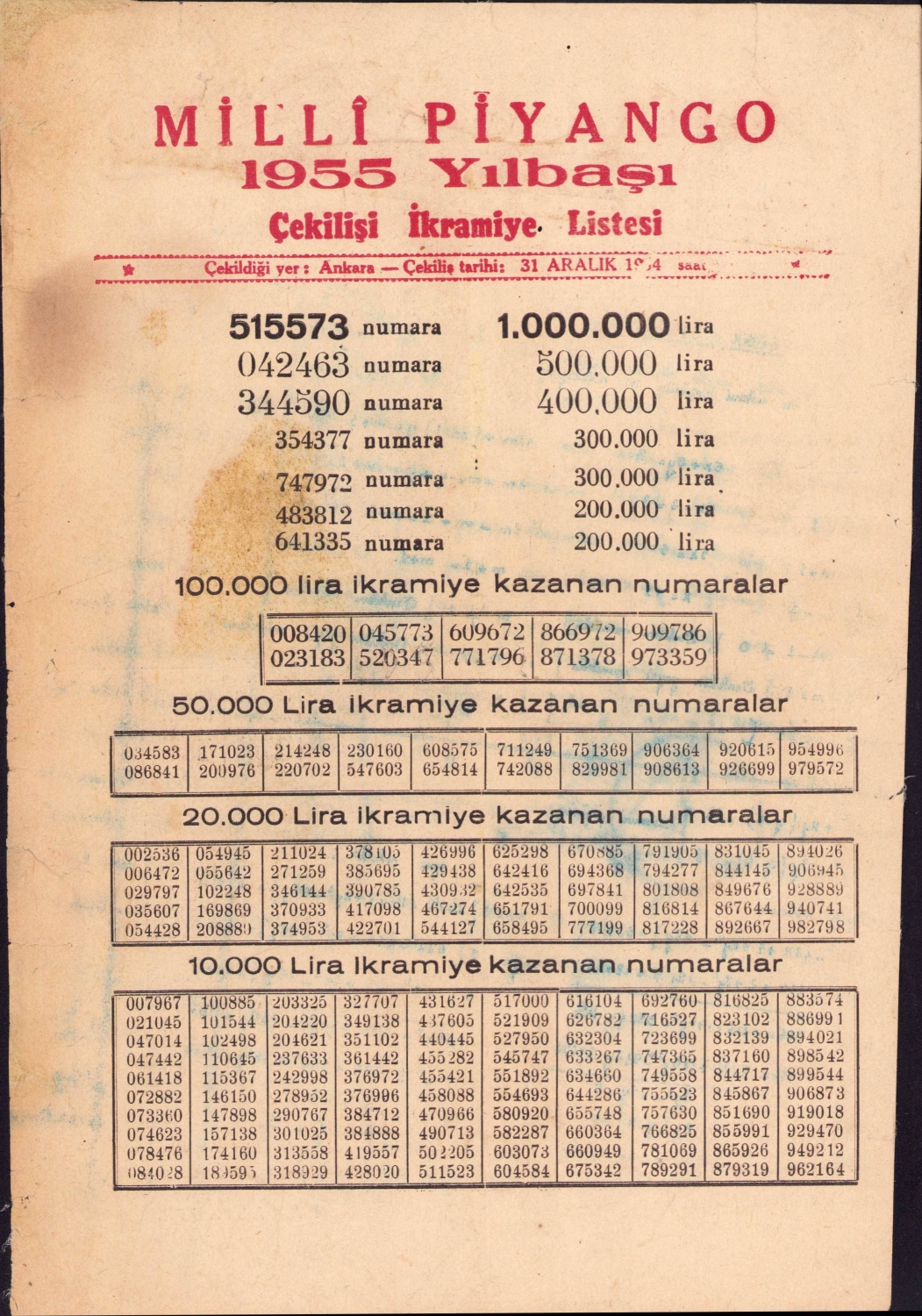 1955 Yılbaşı Milli Piyango çekilişi ikramiye listesi, 20x30 cm