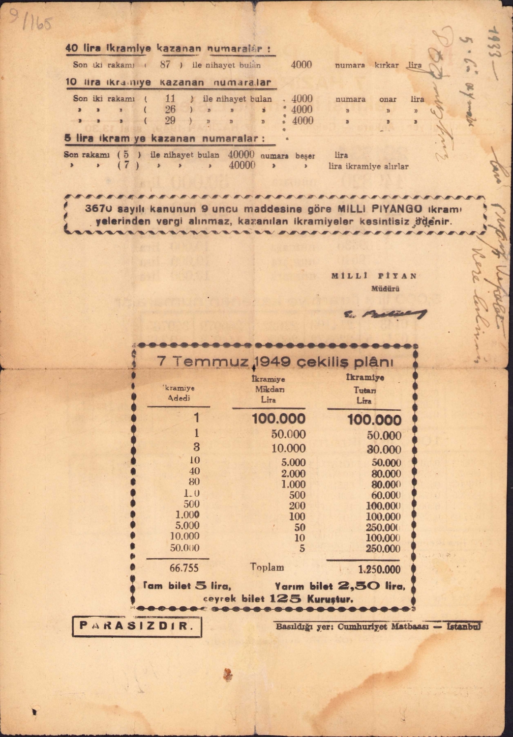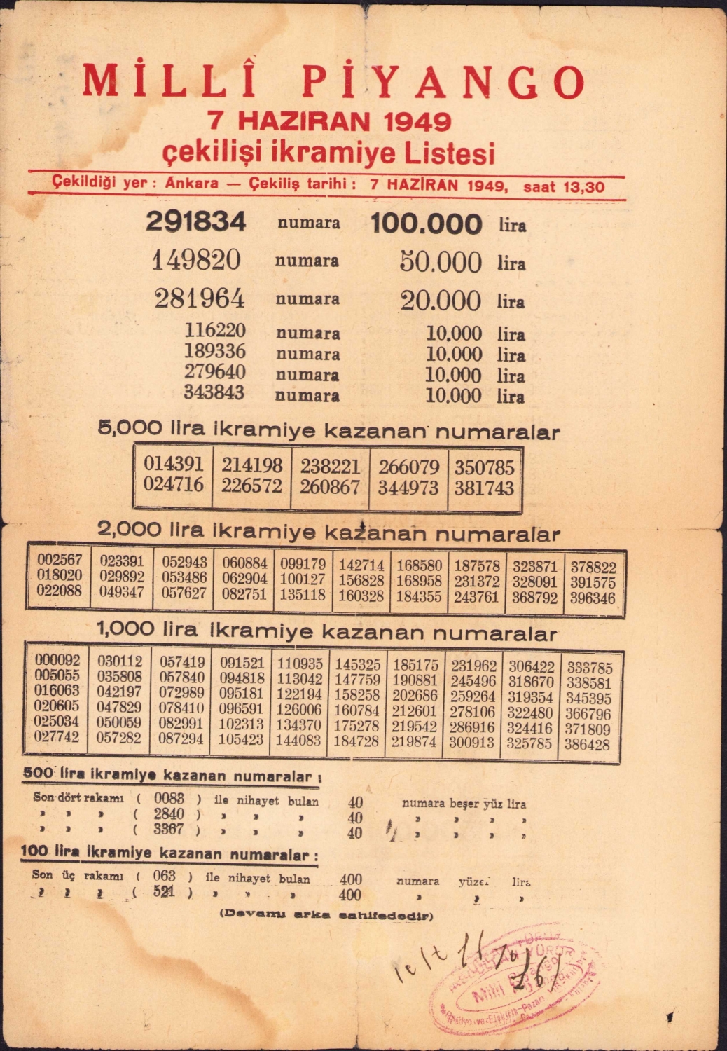 1949 Yılbaşı Milli Piyango çekilişi ikramiye listesi, 20x30 cm