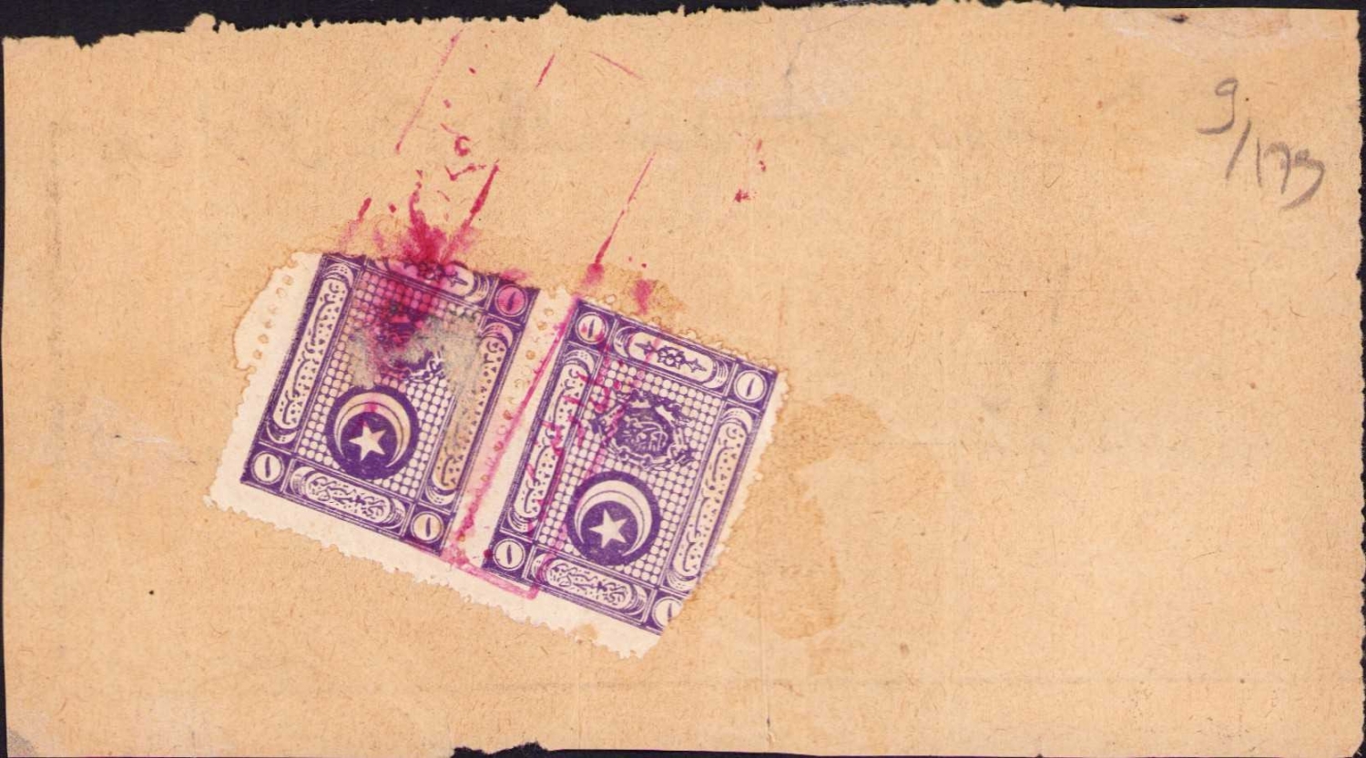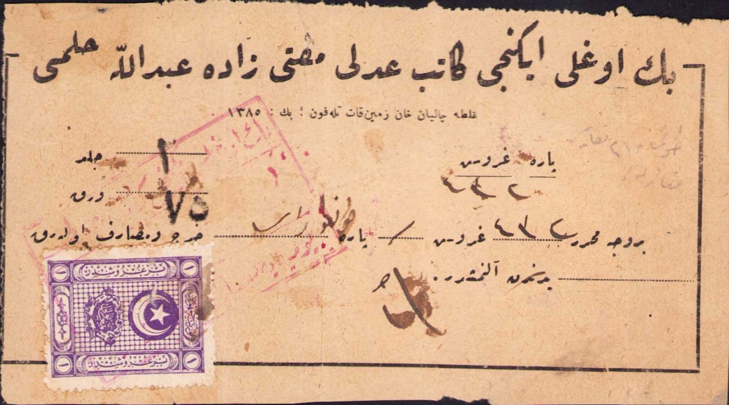 Osmanlıca Beyoğlu İkinci Katip Adli Müfti Zade Abdullah Hilmi antetli senet, 12x7 cm