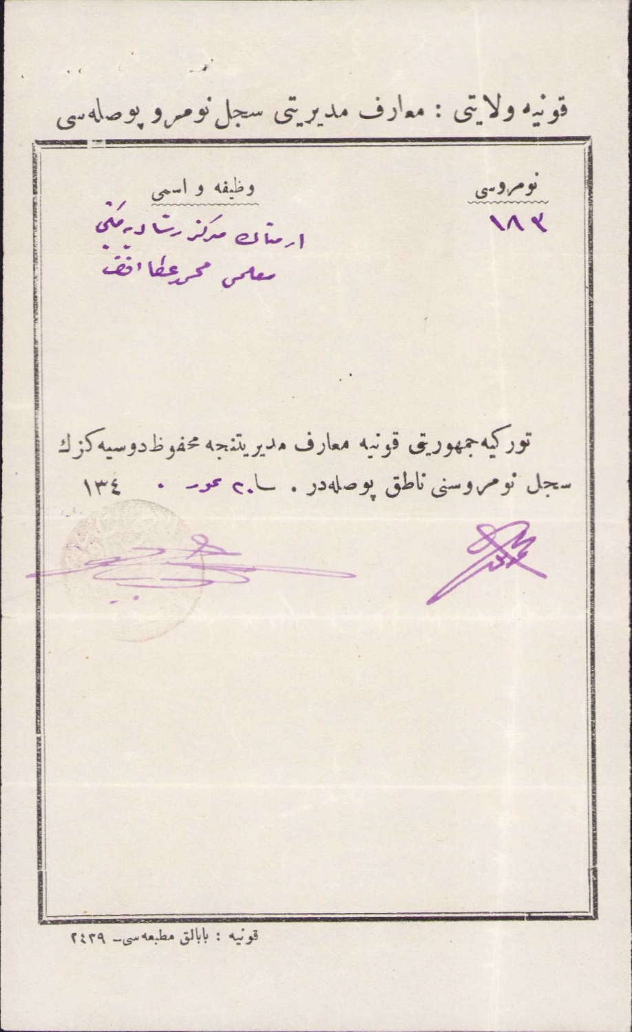 Osmanlıca Konya Vilayeti Maarif Müdüriyeti sicil numara pusulası, Ermenek Merkez Rüştiye Mektebi muallimi Mehmed Ata Efendi, 16x9 cn