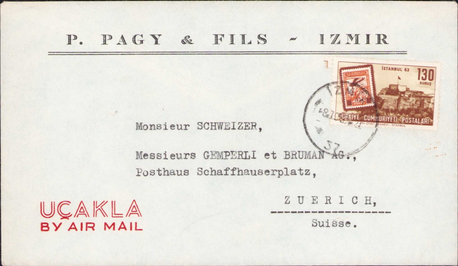 P. Pagy & Fils İzmir antetli zarf, postadan geçmiş
