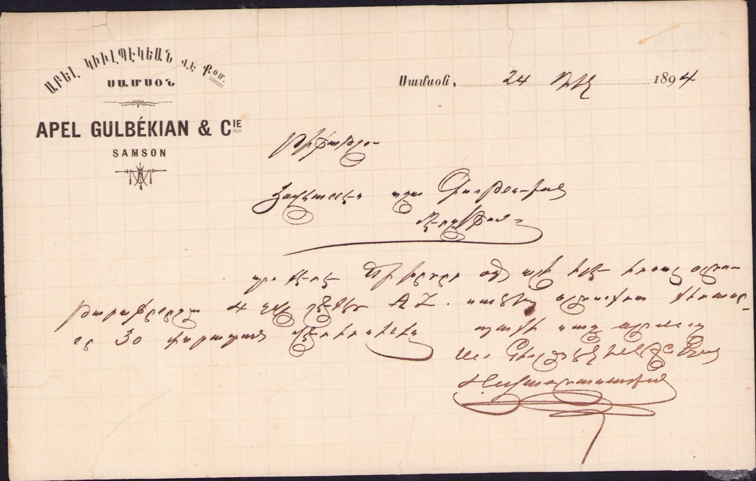 Ermenice - Fransızca Apel Gulbenkian & Co. Samson - Samsun antetli doküman, 1894, kenarları yırtık, 20x24 cm