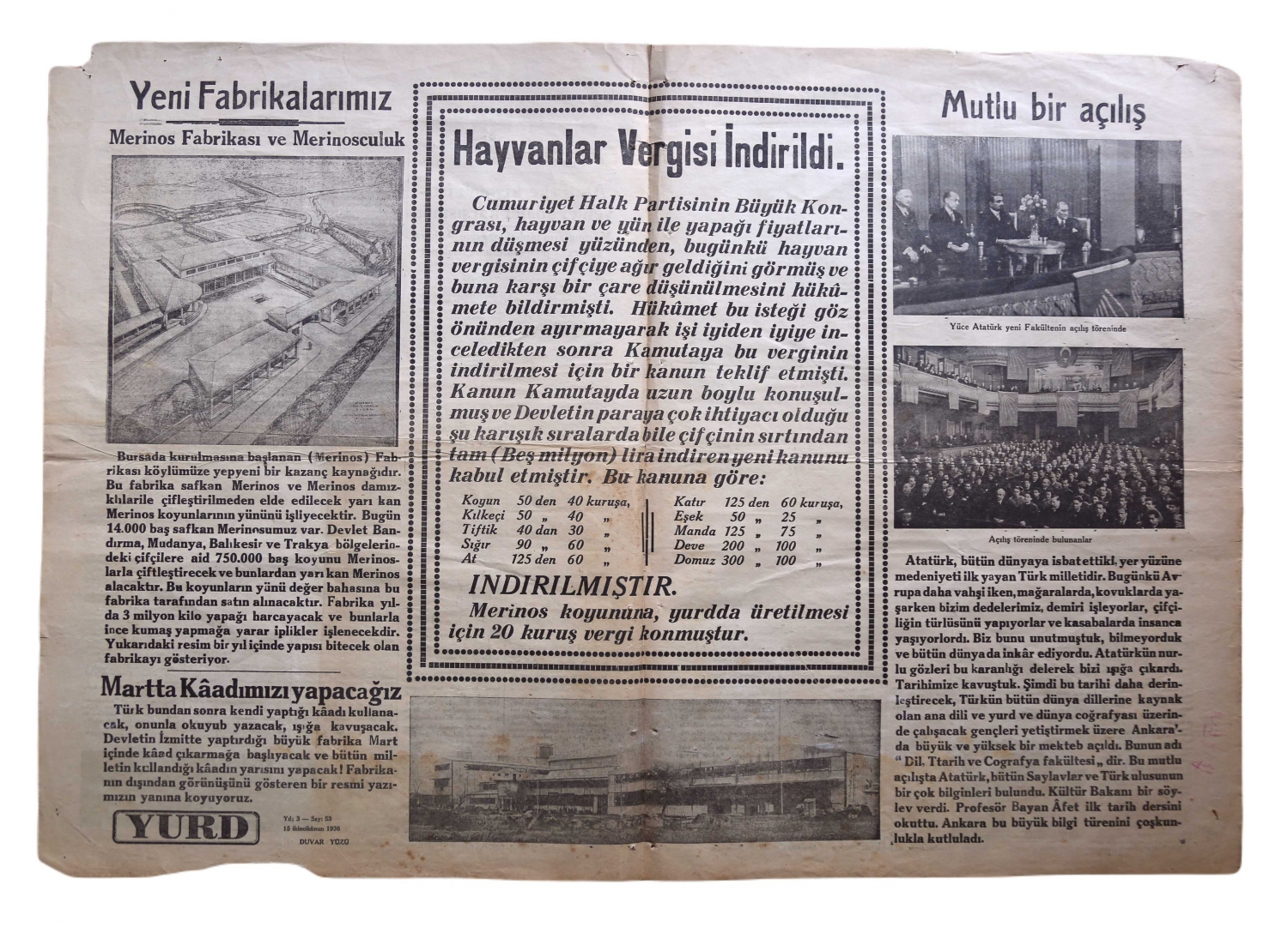 Yurd gazetesi 1936, C. H. Partisinin köylüye armağanı, manşet "Atatürk'e Kıymak İsteyenler Adalet Karşısında" "Tütüncülük", 4 sayfa, 41x55 cm
