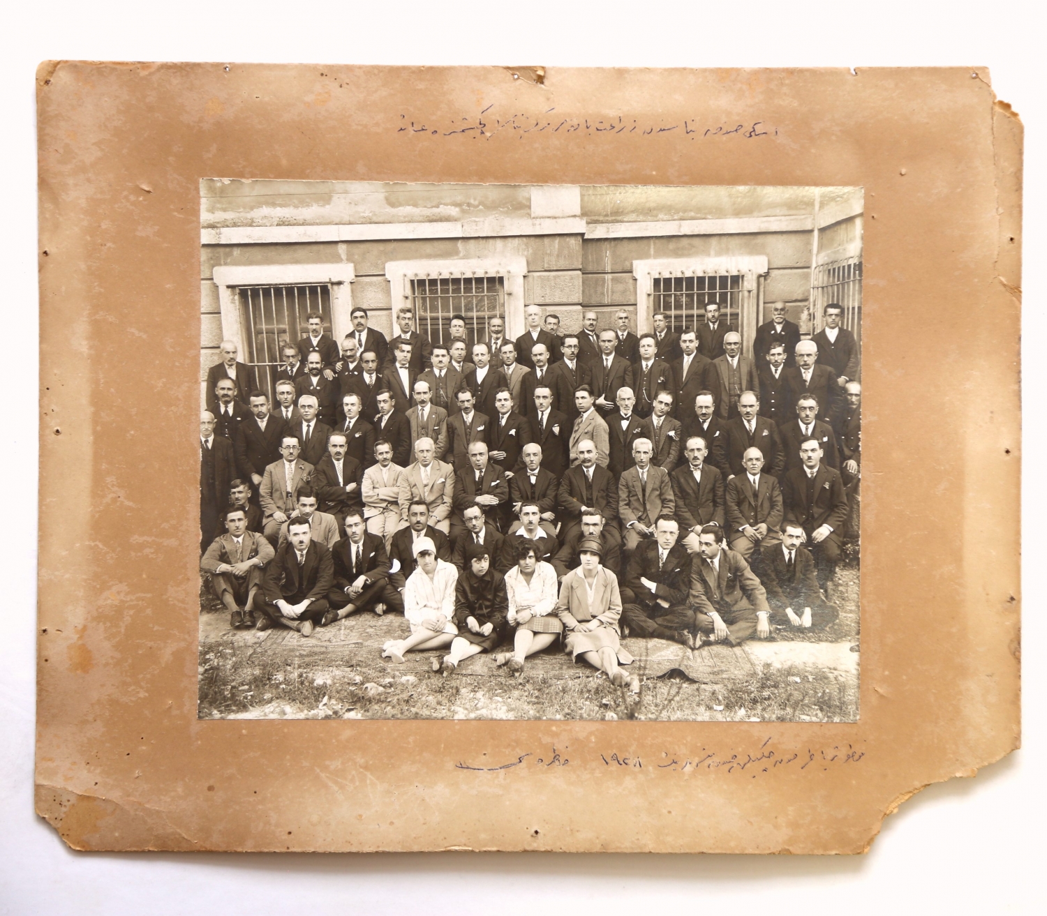 Fotoğrafın üst kısmında Osmanlıca 'Eski sandık binasından Ziraat Bankası Merkez Binası'na taşındığımıza ait', alt tarafında ise "Foto Süreyya tarafından çekilen sandık mütevellilerinin 1928 hatırası" yazmaktadır.