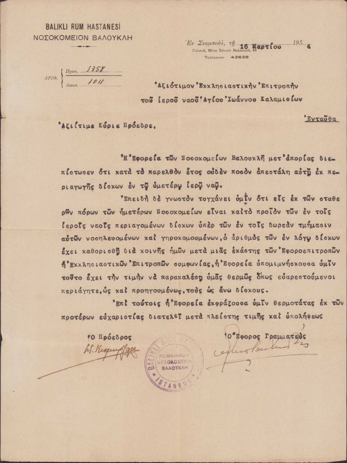 Balıklı Rum Hastahanesi dokümanı, 1954 tarihli, Rumca yazılı, 22,5x30