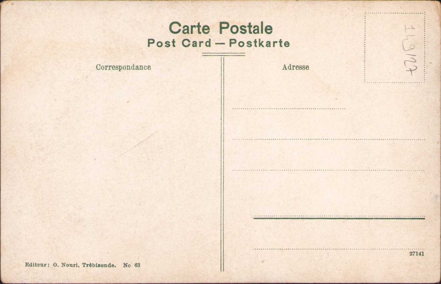 Osmanlı dönemi kartpostal, Trabzon Yöresel Kıyafetler, Editör: O. Nouri, Trebizonde, No:63, Fransızca "Salut de Trebizonde" ve "Costumes nationaux" yazılı.