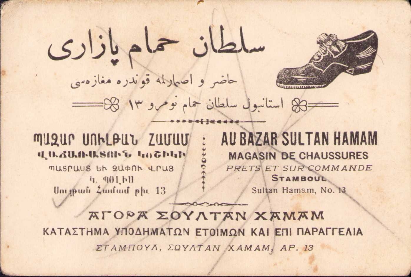 Sultan Hamamı Pazarı Hazır ve Ismarlama Kundura Mağazası iş yeri kartı, Osmanlıca, Ermenice, Rumca ve Fransızca, 11,5x8 cm.