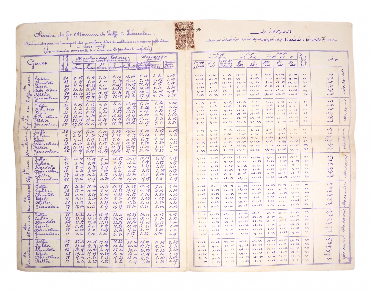 Yafa Kudüs Osmanlı Demiryolu'ndaki asker, araba ve hayvanların taşınması üzerine malumat veren cedvel, Osmanlıca ve Fransızca, pullu, 43x32 cm.